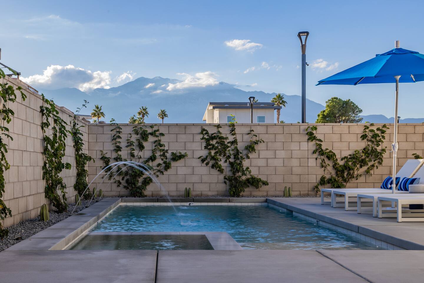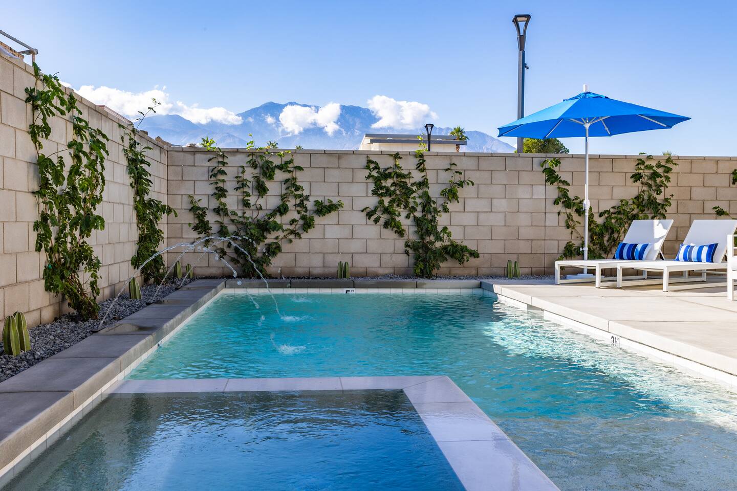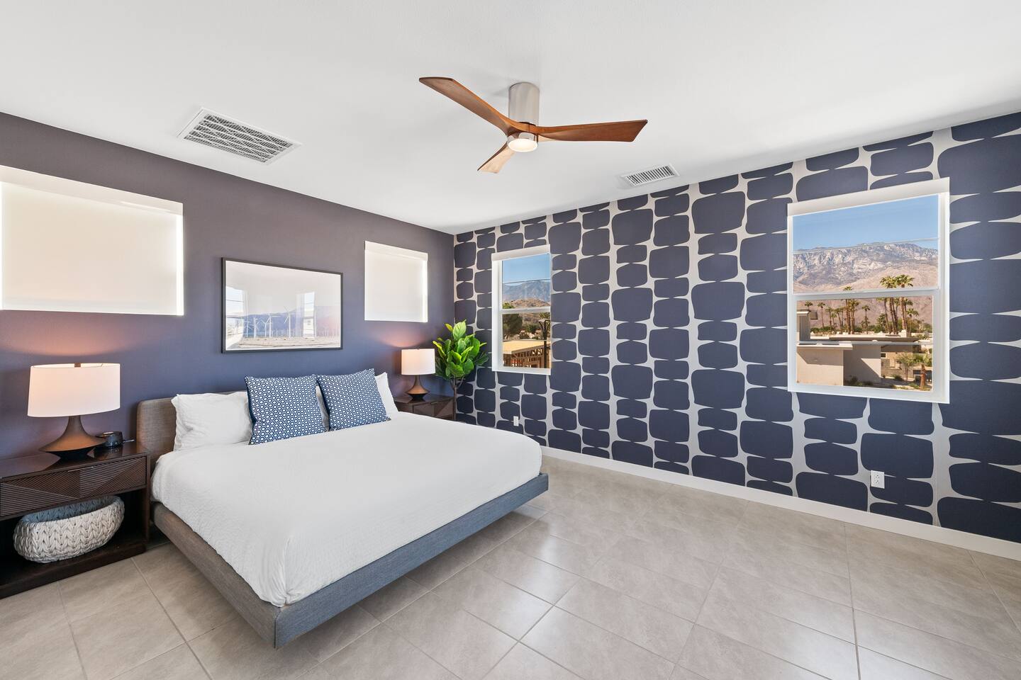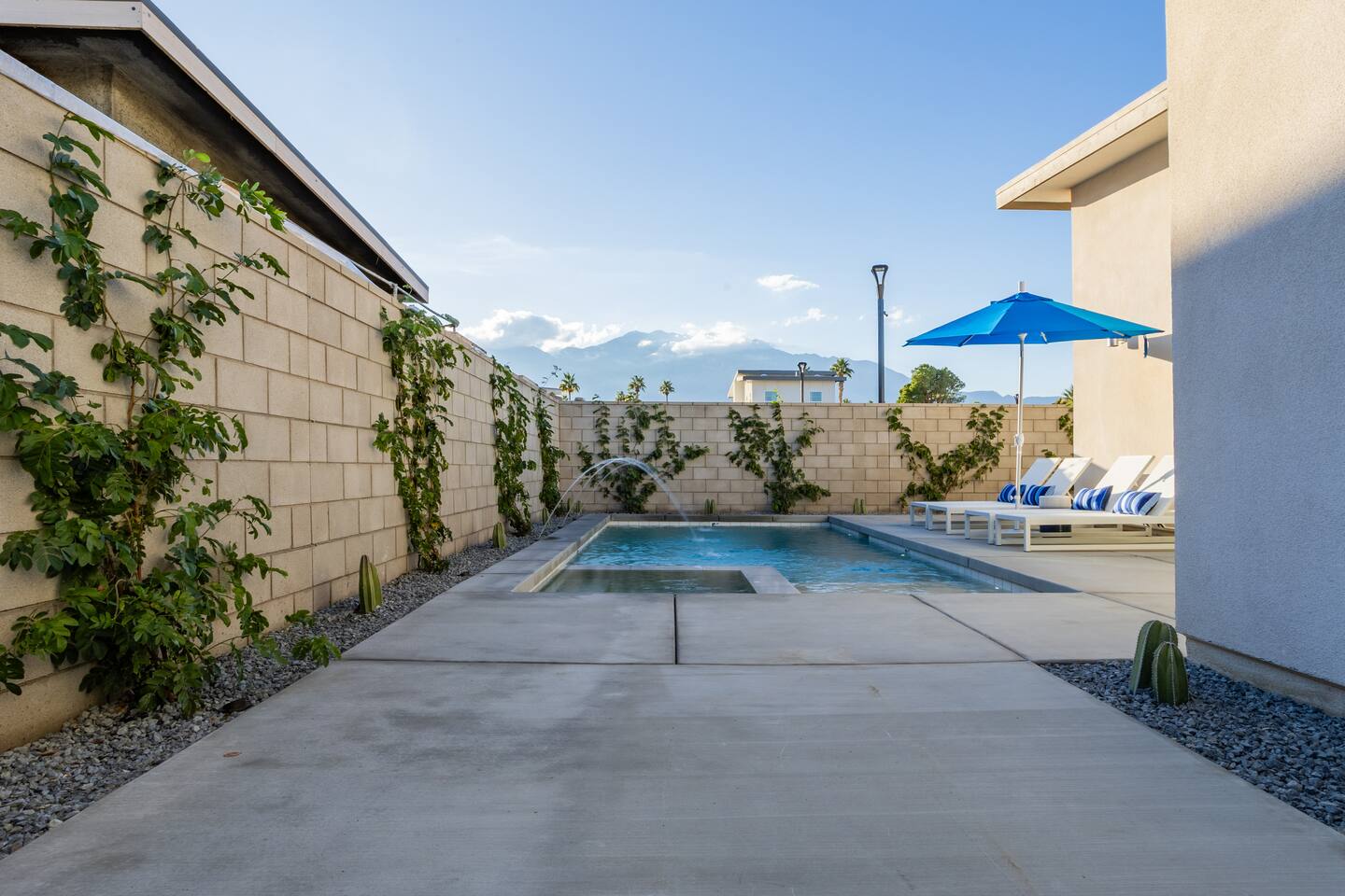 Welcome to your perfect Palm Springs vacation rental! Located in sunny South Palm Springs, this stylish 3-bedroom, 2.5-bath luxury home offers the ideal blend of modern comfort with a "nod" to mid-century design — perfect for families, couples, and golf getaways. Step into your private backyard oasis featuring a sparkling saltwater pool with a spillover spa, a relaxing sun shelf with umbrella sleeve, playful deck jet sprays, four chaise lounge chairs for sunbathing, comfortable conversation seating for four, outdoor dining for six, and a gas grill for evening BBQs under the stars. Inside this modern Palm Springs Airbnb, an expansive great room connects the entryway, living room, dining area, and kitchen. South-facing sliding glass doors flood the space with natural light and open directly to the backyard, while west-facing sliders frame stunning San Jacinto Mountain views. The living room features a plush mid-century modern sofa with feather-stuffed cushions, terrazzo tables perfect for putting your feet up, and a 75” Roku Smart TV paired with a Sonos soundbar for movie nights. Just behind the seating area, you'll find an iconic Saarinen-style oval dining table with seating for six, ideal for group meals or game nights. The fully equipped kitchen makes cooking a breeze with sparkling white quartz countertops, warm gray cabinetry, and stainless steel appliances including a 6-burner gas range, refrigerator with ice maker, microwave, and dishwasher. A casual peninsula offers additional seating for three and helps define the open space. On the main level, the Primary Suite features a king-size bed with a Casper memory foam mattress, a 43" Roku TV, a ceiling fan with light, and a sliding glass door offering direct access to the backyard and stunning mountain views. The ensuite bathroom includes a dual vanity with ample storage, a large walk-in shower, a separate water closet, and a walk-in closet, along with large bedside tables and a 5-drawer dresser for guest storage. Also on the main level are a powder room with a pedestal sink, a laundry room with side-by-side Whirlpool washer and dryer, a well-stocked linen closet, and convenient interior access to the 2-car garage. Upstairs, the Secondary Suite offers mid and long-range mountain views and is outfitted with a king-size bed with a Casper memory foam mattress, a 50" Roku TV, a walk-in closet, and a 6-drawer dresser. This bedroom has direct access to the second full bathroom, which is also shared with the Third Bedroom. The Third Bedroom is furnished with two twin beds (that can be converted to a king upon request) and features a 43" Roku TV and a ceiling fan with a light. Throughout the home, you’ll find sleek, modern 12x24” ceramic tile floors softened by stylish area rugs. For added comfort and privacy, motorized window shades can be controlled either by remote or through the smart home panel in the entry. Located near Tahquitz Creek Golf Resort, this luxury Palm Springs rental provides quick and easy access to downtown Palm Springs, Cathedral City, and Rancho Mirage. Whether you’re here to golf, hike, shop, dine, or simply relax by the pool, this modern retreat offers everything you need for an unforgettable desert escape. Palm Springs City ID #068386