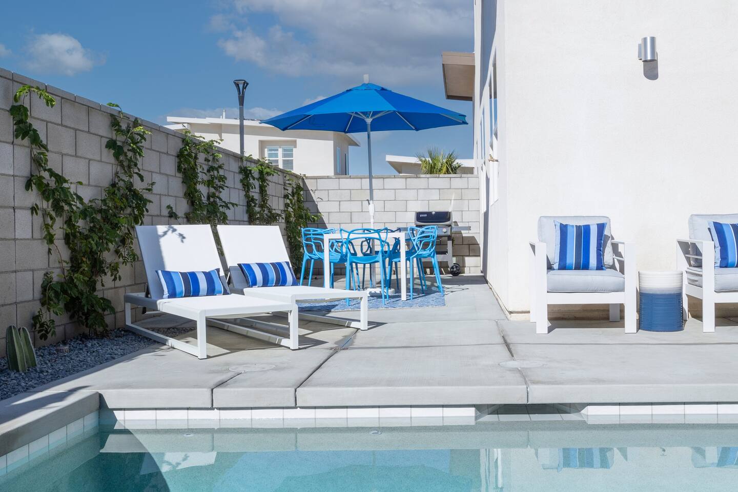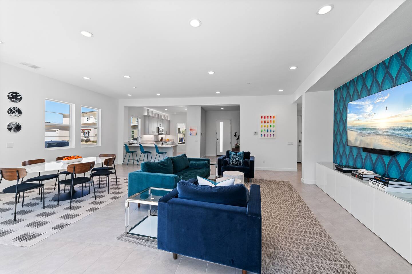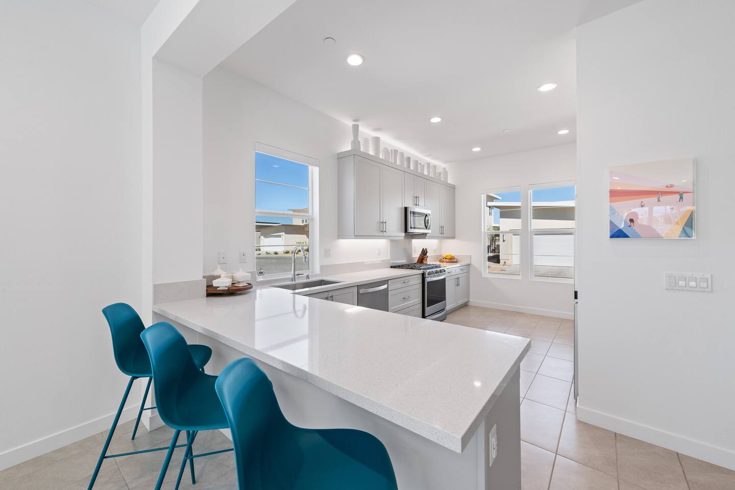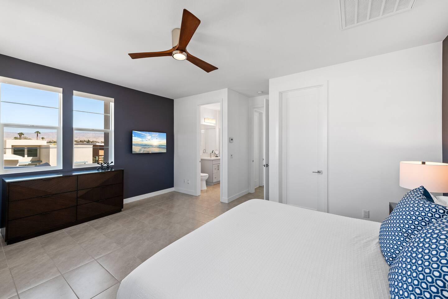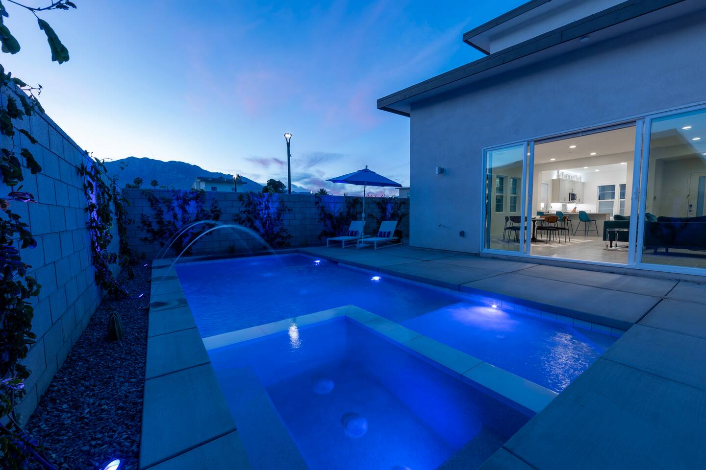 Welcome to your perfect Palm Springs vacation rental! Located in sunny South Palm Springs, this stylish 3-bedroom, 2.5-bath luxury home offers the ideal blend of modern comfort with a "nod" to mid-century design — perfect for families, couples, and golf getaways. Step into your private backyard oasis featuring a sparkling saltwater pool with a spillover spa, a relaxing sun shelf with umbrella sleeve, playful deck jet sprays, four chaise lounge chairs for sunbathing, comfortable conversation seating for four, outdoor dining for six, and a gas grill for evening BBQs under the stars. Inside this modern Palm Springs Airbnb, an expansive great room connects the entryway, living room, dining area, and kitchen. South-facing sliding glass doors flood the space with natural light and open directly to the backyard, while west-facing sliders frame stunning San Jacinto Mountain views. The living room features a plush mid-century modern sofa with feather-stuffed cushions, terrazzo tables perfect for putting your feet up, and a 75” Roku Smart TV paired with a Sonos soundbar for movie nights. Just behind the seating area, you'll find an iconic Saarinen-style oval dining table with seating for six, ideal for group meals or game nights. The fully equipped kitchen makes cooking a breeze with sparkling white quartz countertops, warm gray cabinetry, and stainless steel appliances including a 6-burner gas range, refrigerator with ice maker, microwave, and dishwasher. A casual peninsula offers additional seating for three and helps define the open space. On the main level, the Primary Suite features a king-size bed with a Casper memory foam mattress, a 43" Roku TV, a ceiling fan with light, and a sliding glass door offering direct access to the backyard and stunning mountain views. The ensuite bathroom includes a dual vanity with ample storage, a large walk-in shower, a separate water closet, and a walk-in closet, along with large bedside tables and a 5-drawer dresser for guest storage. Also on the main level are a powder room with a pedestal sink, a laundry room with side-by-side Whirlpool washer and dryer, a well-stocked linen closet, and convenient interior access to the 2-car garage. Upstairs, the Secondary Suite offers mid and long-range mountain views and is outfitted with a king-size bed with a Casper memory foam mattress, a 50" Roku TV, a walk-in closet, and a 6-drawer dresser. This bedroom has direct access to the second full bathroom, which is also shared with the Third Bedroom. The Third Bedroom is furnished with two twin beds (that can be converted to a king upon request) and features a 43" Roku TV and a ceiling fan with a light. Throughout the home, you’ll find sleek, modern 12x24” ceramic tile floors softened by stylish area rugs. For added comfort and privacy, motorized window shades can be controlled either by remote or through the smart home panel in the entry. Located near Tahquitz Creek Golf Resort, this luxury Palm Springs rental provides quick and easy access to downtown Palm Springs, Cathedral City, and Rancho Mirage. Whether you’re here to golf, hike, shop, dine, or simply relax by the pool, this modern retreat offers everything you need for an unforgettable desert escape. Palm Springs City ID #068386