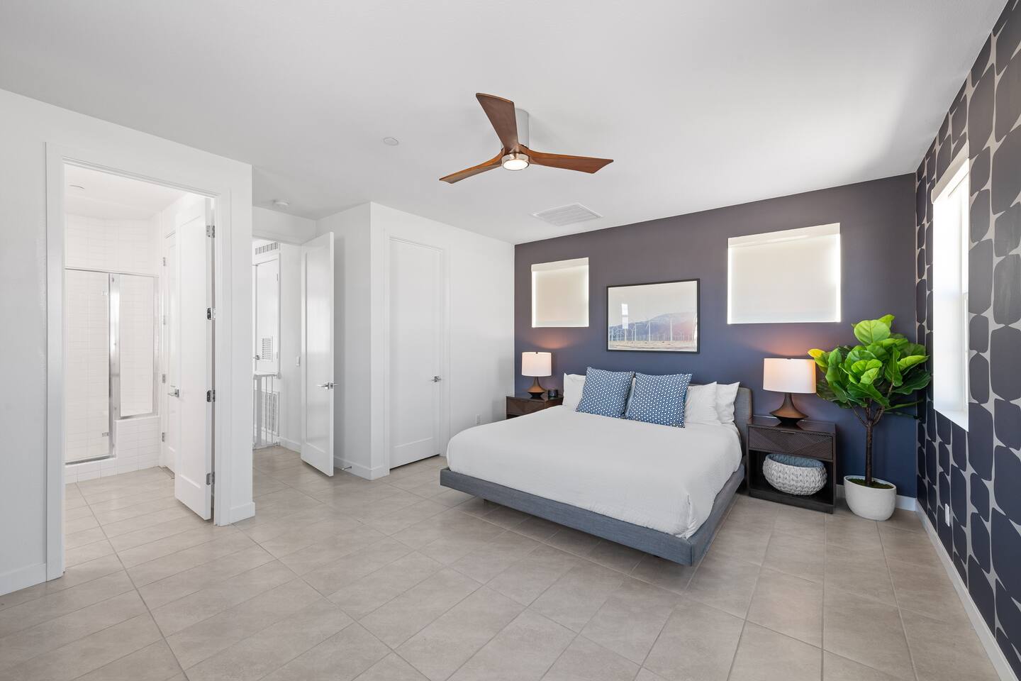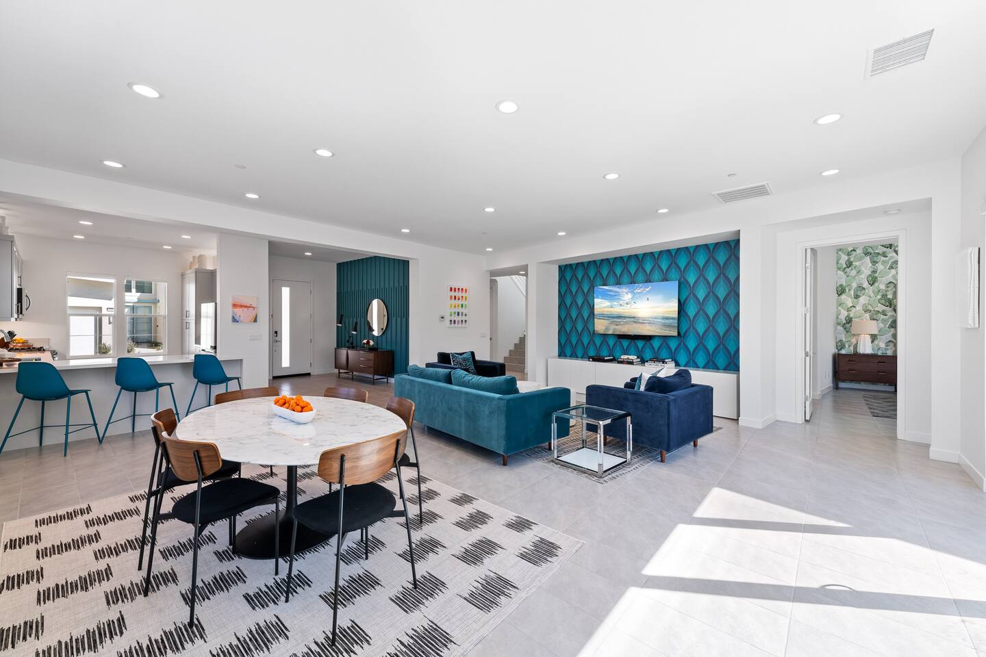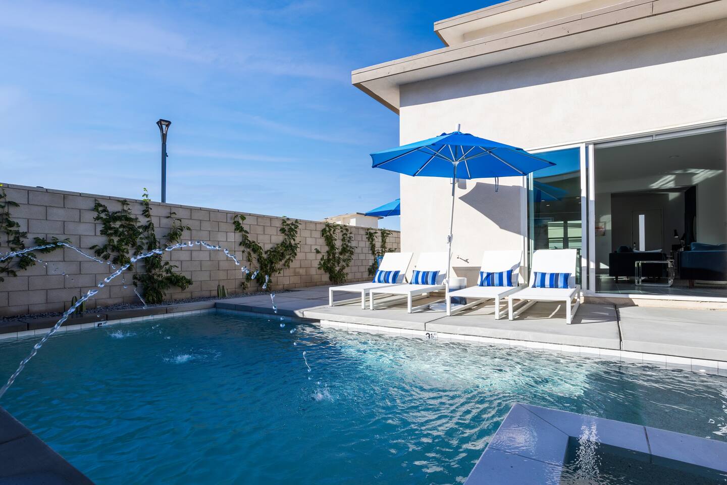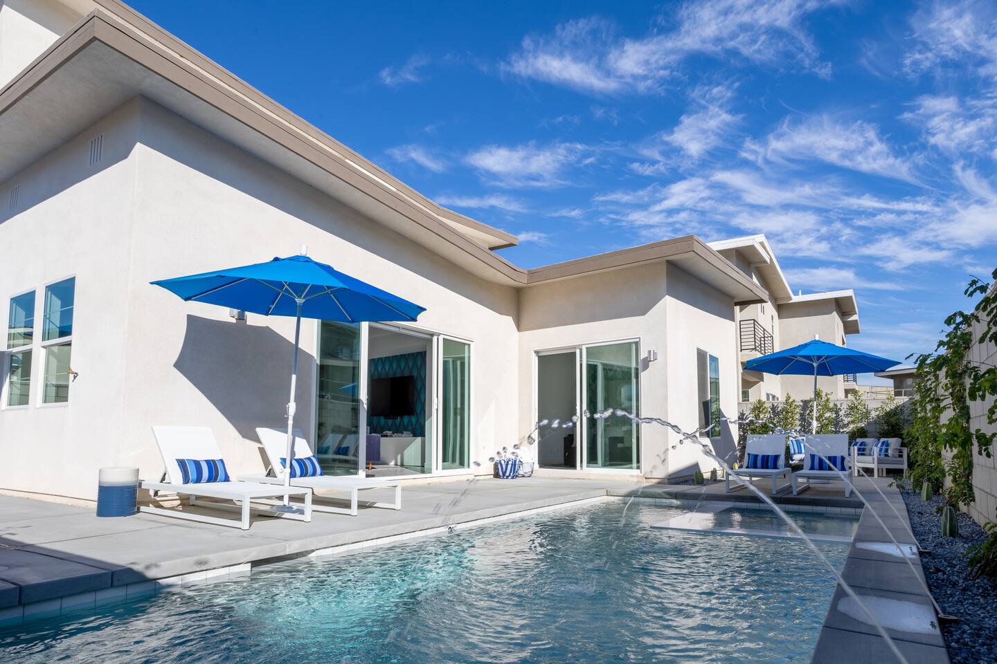 Welcome to your perfect Palm Springs vacation rental! Located in sunny South Palm Springs, this stylish 3-bedroom, 2.5-bath luxury home offers the ideal blend of modern comfort with a "nod" to mid-century design — perfect for families, couples, and golf getaways. Step into your private backyard oasis featuring a sparkling saltwater pool with a spillover spa, a relaxing sun shelf with umbrella sleeve, playful deck jet sprays, four chaise lounge chairs for sunbathing, comfortable conversation seating for four, outdoor dining for six, and a gas grill for evening BBQs under the stars. Inside this modern Palm Springs Airbnb, an expansive great room connects the entryway, living room, dining area, and kitchen. South-facing sliding glass doors flood the space with natural light and open directly to the backyard, while west-facing sliders frame stunning San Jacinto Mountain views. The living room features a plush mid-century modern sofa with feather-stuffed cushions, terrazzo tables perfect for putting your feet up, and a 75” Roku Smart TV paired with a Sonos soundbar for movie nights. Just behind the seating area, you'll find an iconic Saarinen-style oval dining table with seating for six, ideal for group meals or game nights. The fully equipped kitchen makes cooking a breeze with sparkling white quartz countertops, warm gray cabinetry, and stainless steel appliances including a 6-burner gas range, refrigerator with ice maker, microwave, and dishwasher. A casual peninsula offers additional seating for three and helps define the open space. On the main level, the Primary Suite features a king-size bed with a Casper memory foam mattress, a 43" Roku TV, a ceiling fan with light, and a sliding glass door offering direct access to the backyard and stunning mountain views. The ensuite bathroom includes a dual vanity with ample storage, a large walk-in shower, a separate water closet, and a walk-in closet, along with large bedside tables and a 5-drawer dresser for guest storage. Also on the main level are a powder room with a pedestal sink, a laundry room with side-by-side Whirlpool washer and dryer, a well-stocked linen closet, and convenient interior access to the 2-car garage. Upstairs, the Secondary Suite offers mid and long-range mountain views and is outfitted with a king-size bed with a Casper memory foam mattress, a 50" Roku TV, a walk-in closet, and a 6-drawer dresser. This bedroom has direct access to the second full bathroom, which is also shared with the Third Bedroom. The Third Bedroom is furnished with two twin beds (that can be converted to a king upon request) and features a 43" Roku TV and a ceiling fan with a light. Throughout the home, you’ll find sleek, modern 12x24” ceramic tile floors softened by stylish area rugs. For added comfort and privacy, motorized window shades can be controlled either by remote or through the smart home panel in the entry. Located near Tahquitz Creek Golf Resort, this luxury Palm Springs rental provides quick and easy access to downtown Palm Springs, Cathedral City, and Rancho Mirage. Whether you’re here to golf, hike, shop, dine, or simply relax by the pool, this modern retreat offers everything you need for an unforgettable desert escape. Palm Springs City ID #068386