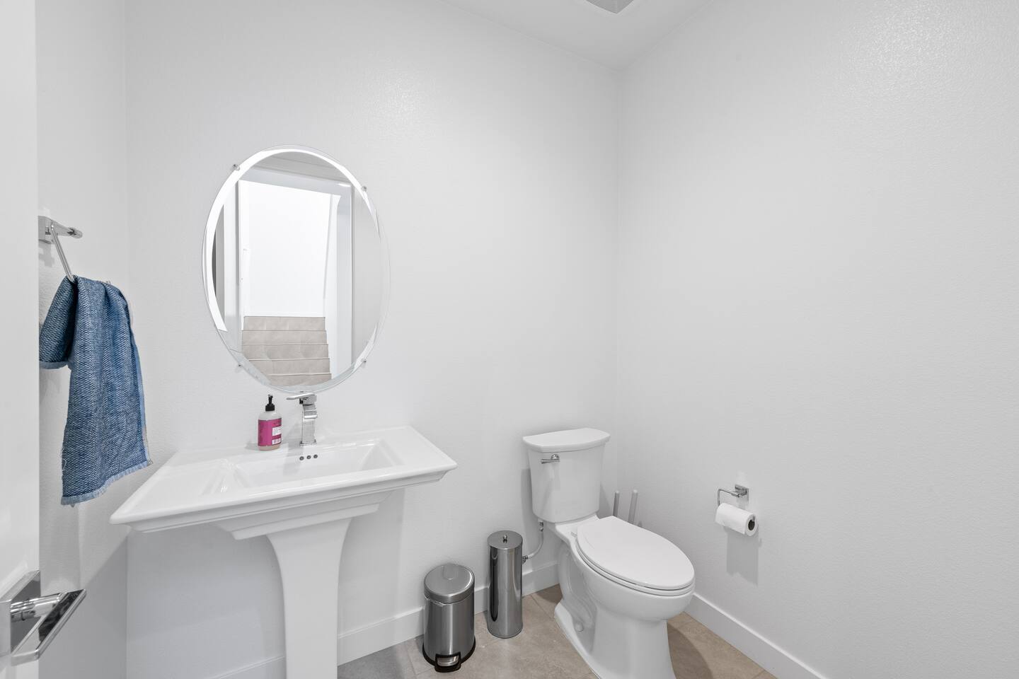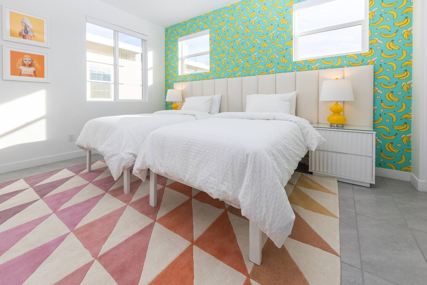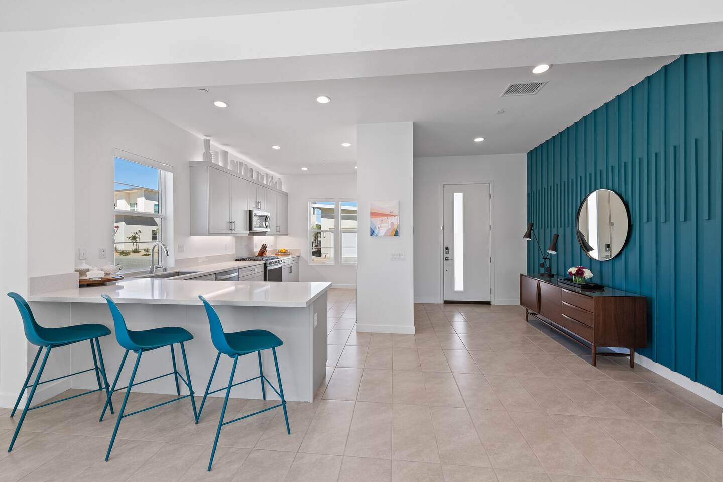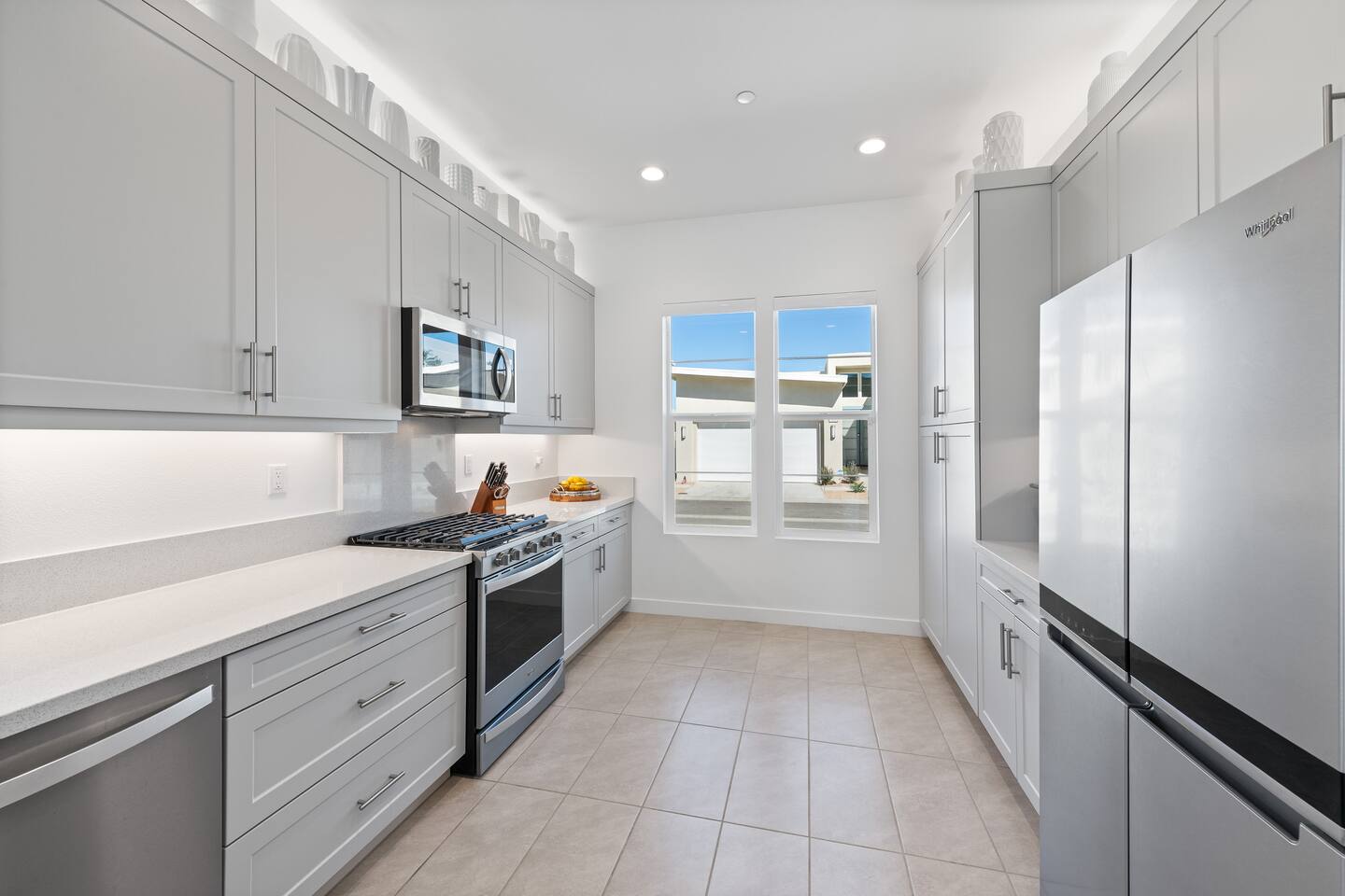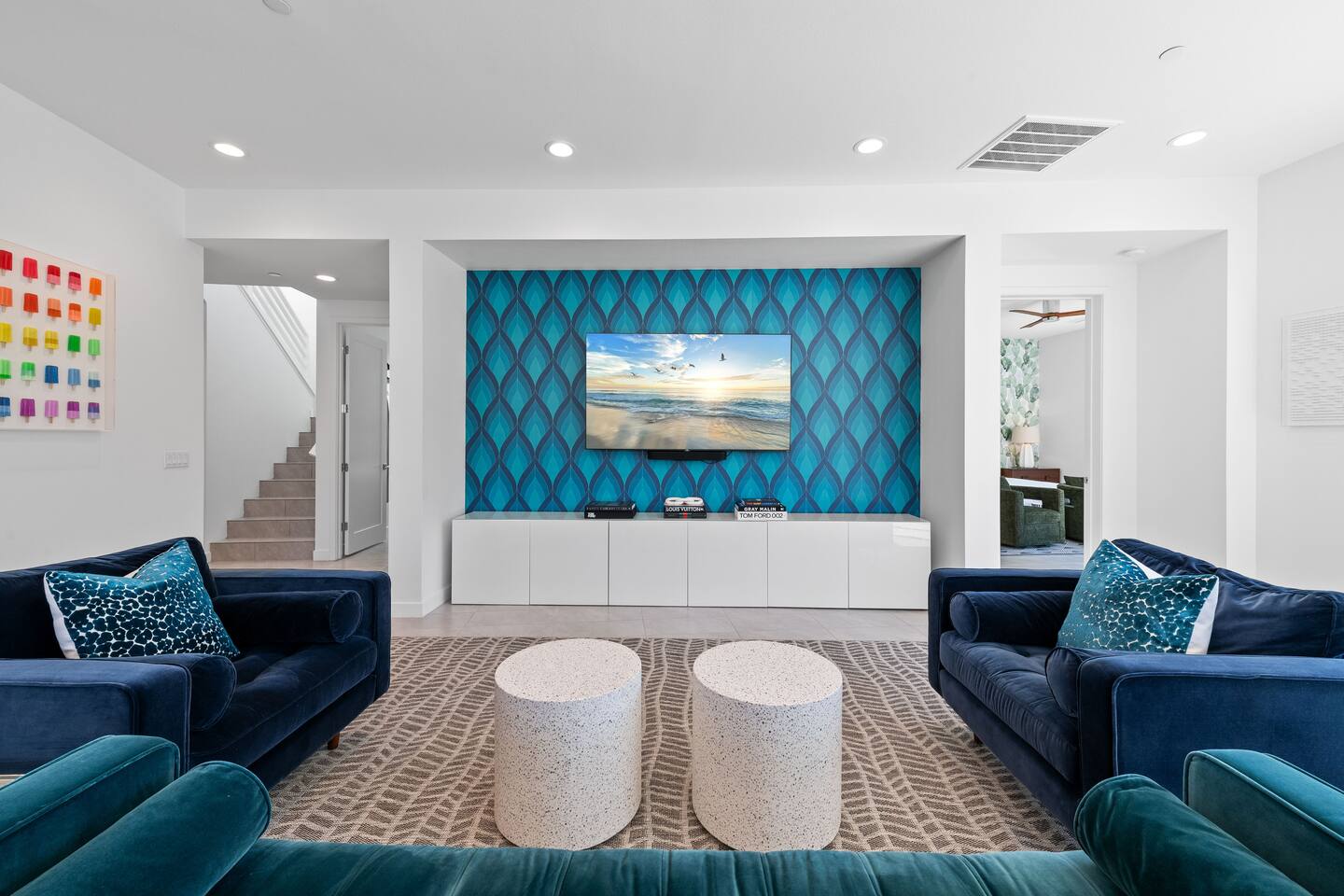 Welcome to your perfect Palm Springs vacation rental! Located in sunny South Palm Springs, this stylish 3-bedroom, 2.5-bath luxury home offers the ideal blend of modern comfort with a "nod" to mid-century design — perfect for families, couples, and golf getaways. Step into your private backyard oasis featuring a sparkling saltwater pool with a spillover spa, a relaxing sun shelf with umbrella sleeve, playful deck jet sprays, four chaise lounge chairs for sunbathing, comfortable conversation seating for four, outdoor dining for six, and a gas grill for evening BBQs under the stars. Inside this modern Palm Springs Airbnb, an expansive great room connects the entryway, living room, dining area, and kitchen. South-facing sliding glass doors flood the space with natural light and open directly to the backyard, while west-facing sliders frame stunning San Jacinto Mountain views. The living room features a plush mid-century modern sofa with feather-stuffed cushions, terrazzo tables perfect for putting your feet up, and a 75” Roku Smart TV paired with a Sonos soundbar for movie nights. Just behind the seating area, you'll find an iconic Saarinen-style oval dining table with seating for six, ideal for group meals or game nights. The fully equipped kitchen makes cooking a breeze with sparkling white quartz countertops, warm gray cabinetry, and stainless steel appliances including a 6-burner gas range, refrigerator with ice maker, microwave, and dishwasher. A casual peninsula offers additional seating for three and helps define the open space. On the main level, the Primary Suite features a king-size bed with a Casper memory foam mattress, a 43" Roku TV, a ceiling fan with light, and a sliding glass door offering direct access to the backyard and stunning mountain views. The ensuite bathroom includes a dual vanity with ample storage, a large walk-in shower, a separate water closet, and a walk-in closet, along with large bedside tables and a 5-drawer dresser for guest storage. Also on the main level are a powder room with a pedestal sink, a laundry room with side-by-side Whirlpool washer and dryer, a well-stocked linen closet, and convenient interior access to the 2-car garage. Upstairs, the Secondary Suite offers mid and long-range mountain views and is outfitted with a king-size bed with a Casper memory foam mattress, a 50" Roku TV, a walk-in closet, and a 6-drawer dresser. This bedroom has direct access to the second full bathroom, which is also shared with the Third Bedroom. The Third Bedroom is furnished with two twin beds (that can be converted to a king upon request) and features a 43" Roku TV and a ceiling fan with a light. Throughout the home, you’ll find sleek, modern 12x24” ceramic tile floors softened by stylish area rugs. For added comfort and privacy, motorized window shades can be controlled either by remote or through the smart home panel in the entry. Located near Tahquitz Creek Golf Resort, this luxury Palm Springs rental provides quick and easy access to downtown Palm Springs, Cathedral City, and Rancho Mirage. Whether you’re here to golf, hike, shop, dine, or simply relax by the pool, this modern retreat offers everything you need for an unforgettable desert escape. Palm Springs City ID #068386