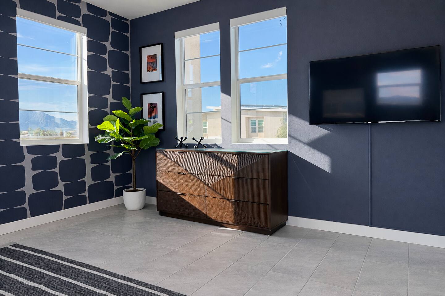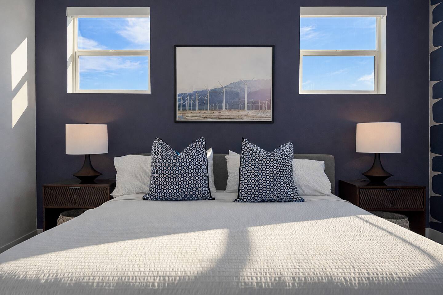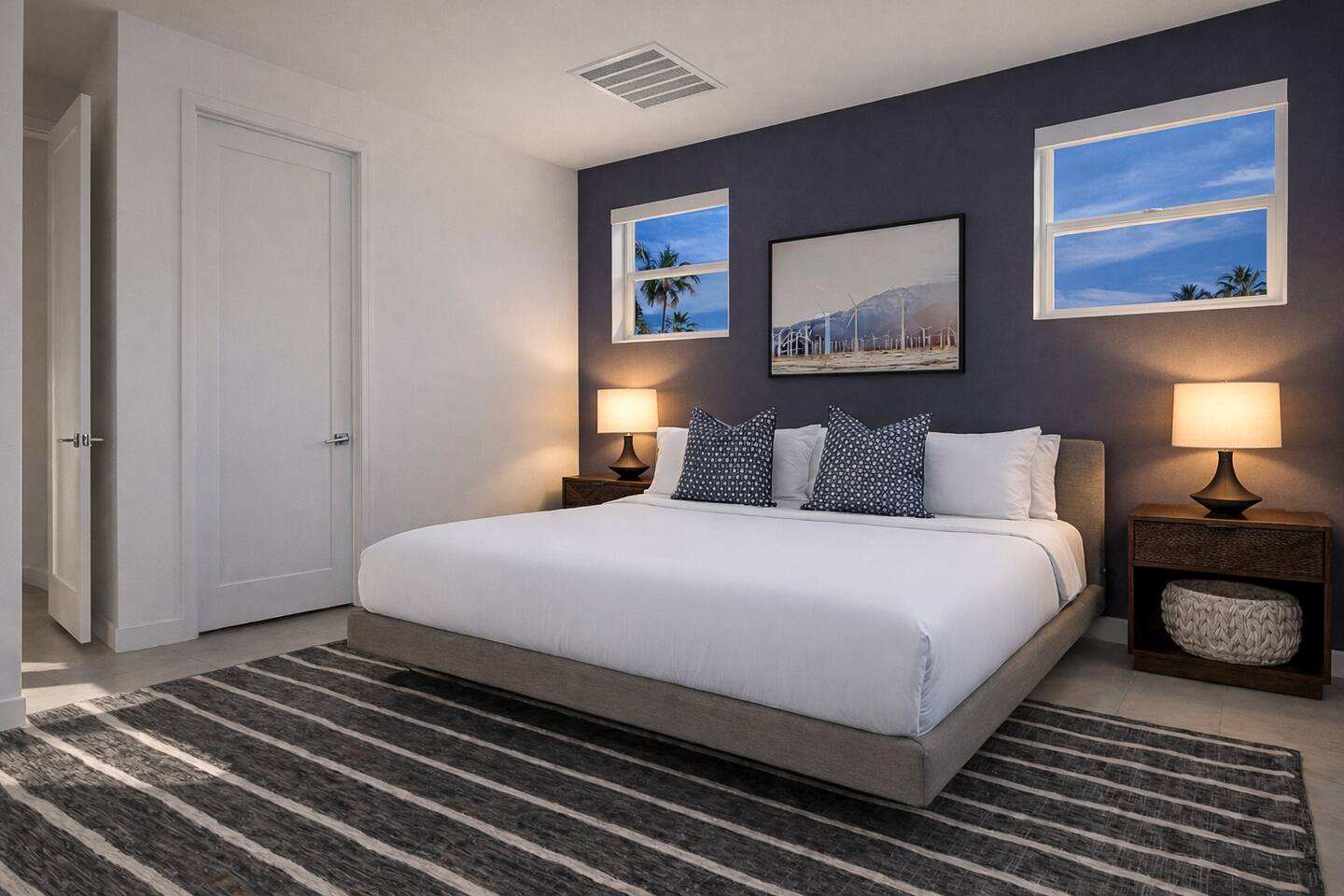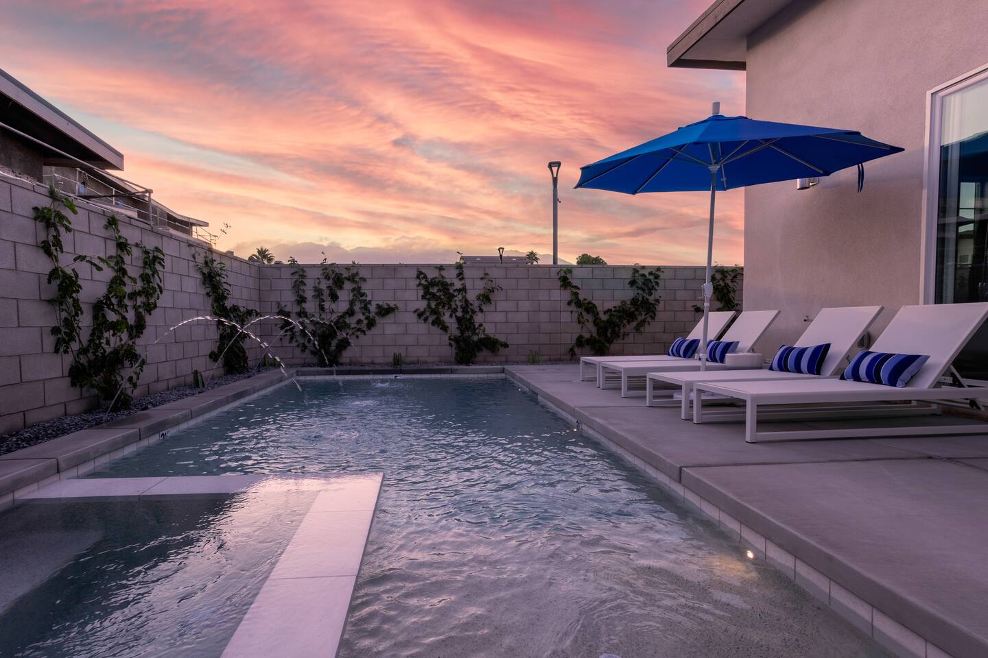 Joules @ The Lumen is a modern 3BR, 2.5BA vacation home in south Palm Springs, near Tahquitz Creek Golf Resort—perfect for golfers and snowbirds. The home is ideal for 2–4 guests with dual primary suites featuring king-sized beds, or up to 6 guests with a flexible third bedroom that can be set up with two twin beds or a king. Built in 2023 with a "nod" to mid-mod design, the home offers stunning views of the San Jacinto Mountains, saltwater pool/spa, fire pit, BBQ, and dining for 6.