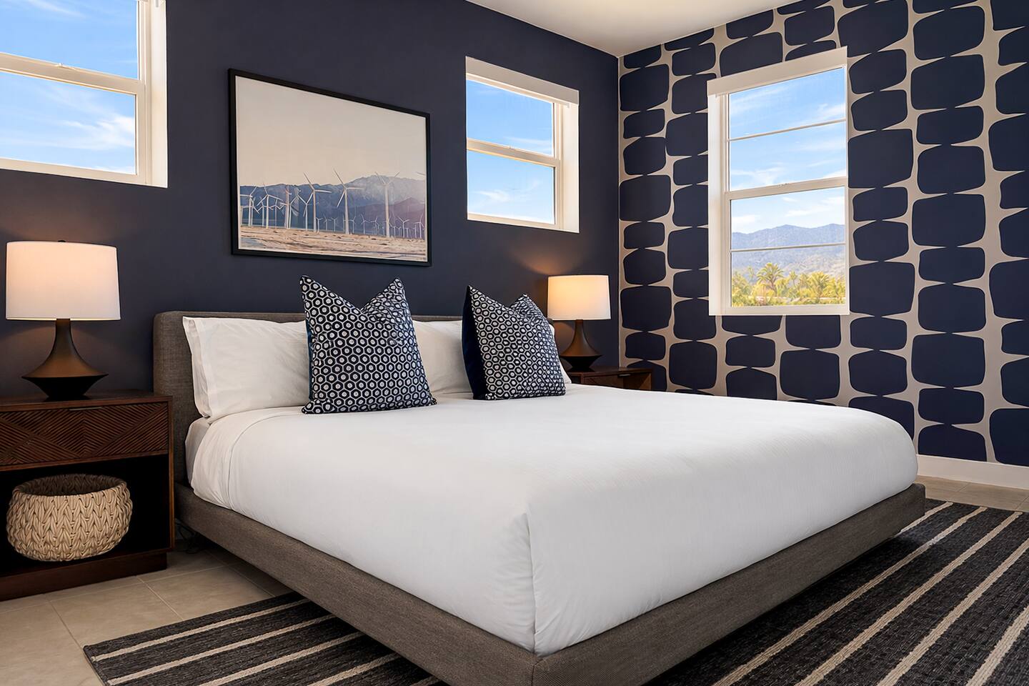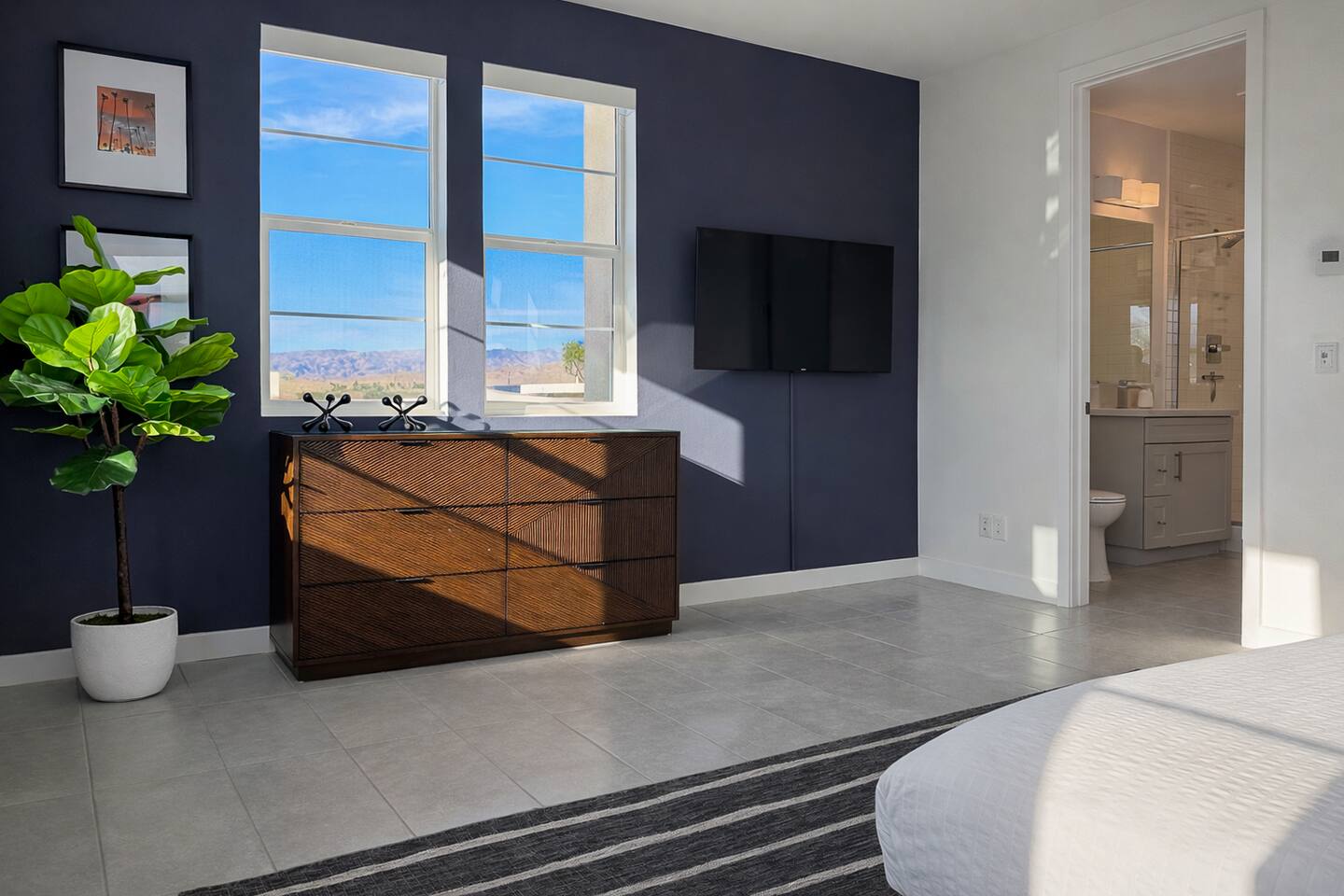 Welcome to your perfect Palm Springs retreat. Located in sunny South Palm Springs, this stylish 3-bedroom, 2.5-bath luxury home blends modern comfort with a nod to mid-century design, ideal for families, couples, snowbirds, and golf getaways. Step into your private backyard oasis featuring a sparkling saltwater pool with a heated spillover spa, a relaxing sun shelf with umbrella sleeve, playful deck jets, four chaise lounges for sunbathing, comfortable conversation seating for four, outdoor dining for six, and a gas grill for evening BBQs under the stars. Pool heating is available as an optional add-on service for an additional fee, must be arranged prior to arrival, and is booked for the full duration of your stay. Inside, an expansive great room connects the entry, living area, dining space, and kitchen. South-facing sliding glass doors flood the home with natural light and open directly to the backyard, while west-facing sliders frame beautiful San Jacinto Mountain views. The living room features a plush mid-century-inspired sofa with feather-filled cushions, terrazzo tables, and a 75” Roku Smart TV paired with a Sonos soundbar for movie nights. Just beyond the seating area, an iconic Saarinen-style oval dining table seats six for memorable dinners and game nights. The fully equipped kitchen features white quartz countertops, warm gray cabinetry, and stainless steel appliances including a 6-burner gas range, refrigerator with ice maker, microwave, and dishwasher. A peninsula with seating for three adds casual gathering space. On the main level, the Primary Suite offers a king bed with Casper memory foam mattress, a 43” Roku TV, ceiling fan, and sliding glass doors with direct backyard access and mountain views. The ensuite bathroom includes a dual vanity, large walk-in shower, private water closet, and walk-in closet, along with generous storage. Also on the main level are a powder room, laundry room with side-by-side Whirlpool washer and dryer, linen closet, and interior access to the two-car garage. Upstairs, the Secondary Suite offers mountain views, a king bed with Casper memory foam mattress, a 50” Roku TV, walk-in closet, and dresser. It features direct access to the second full bathroom, which also provides hallway access for the Third Bedroom. The Third Bedroom is furnished with two twin beds by default and includes a 43” Roku TV and ceiling fan. For added flexibility, guests may request a king-bed conversion or office configuration with a standing desk prior to arrival. This optional setup service is available for an additional fee. Throughout the home, sleek 12x24” ceramic tile floors are softened by stylish area rugs. Motorized window shades can be controlled by remote or through the smart home panel for added comfort and privacy. Located near Tahquitz Creek Golf Resort, this luxury Palm Springs vacation rental offers easy access to downtown Palm Springs, Cathedral City, and Rancho Mirage. Whether you’re here to golf, hike, shop, dine, work remotely, or simply relax by the pool, this modern desert retreat has everything you need for an unforgettable stay. Palm Springs City ID #068386