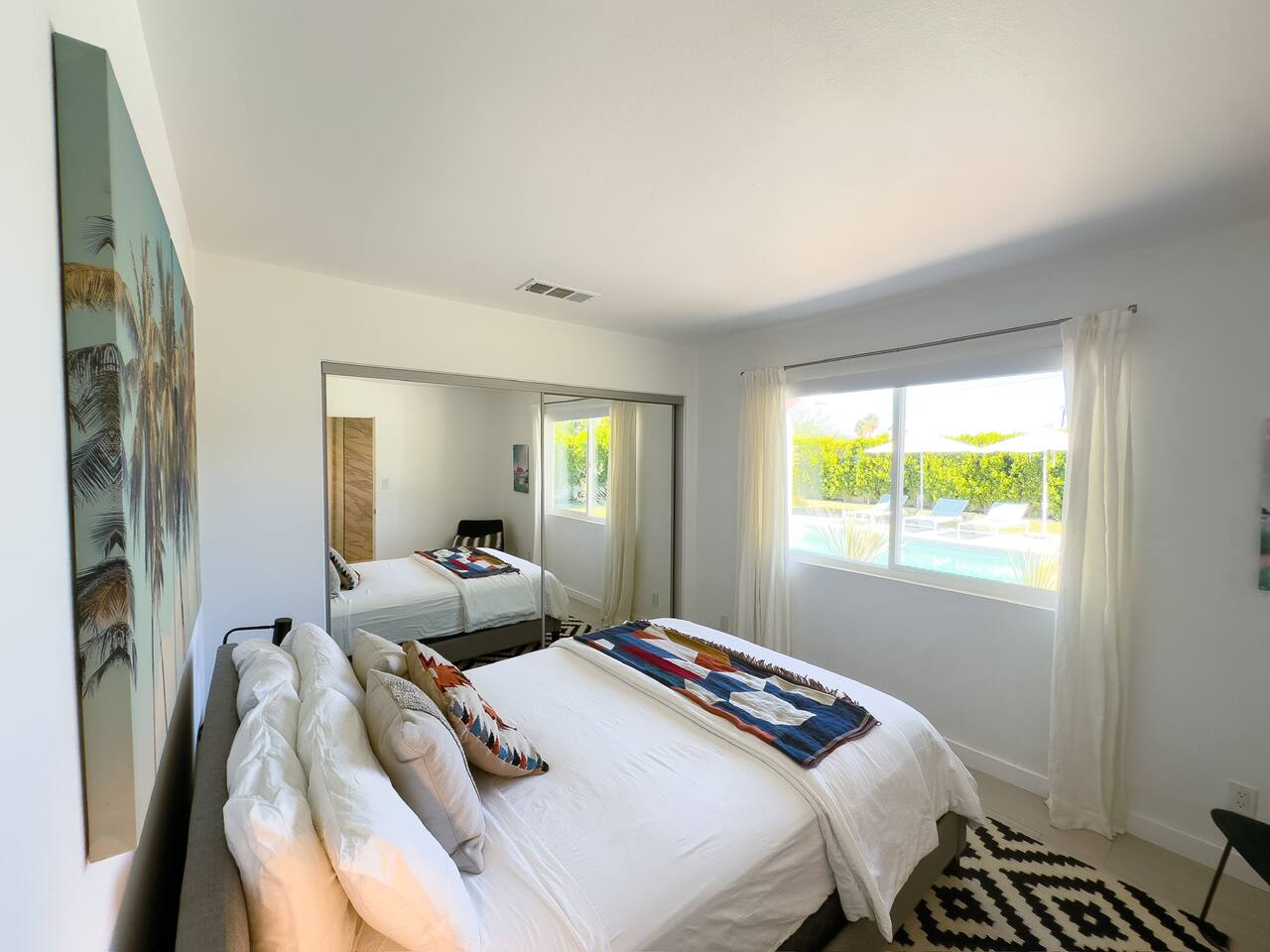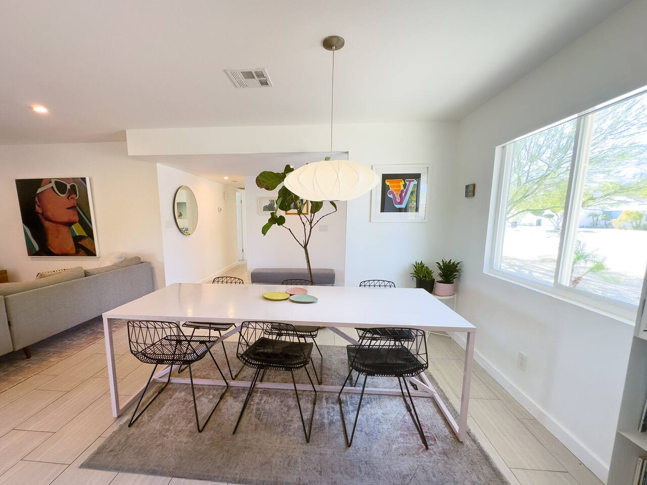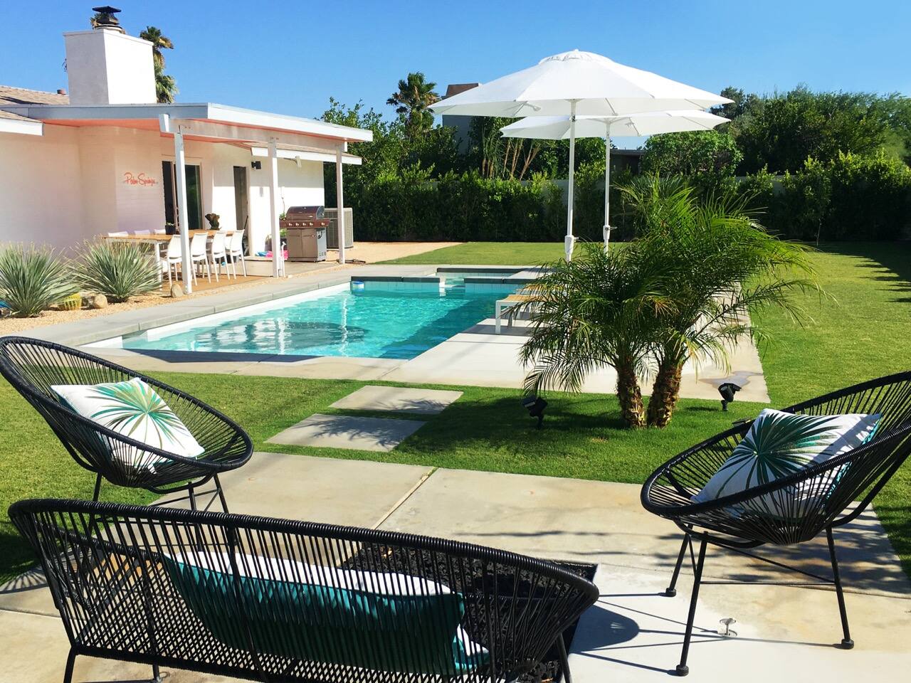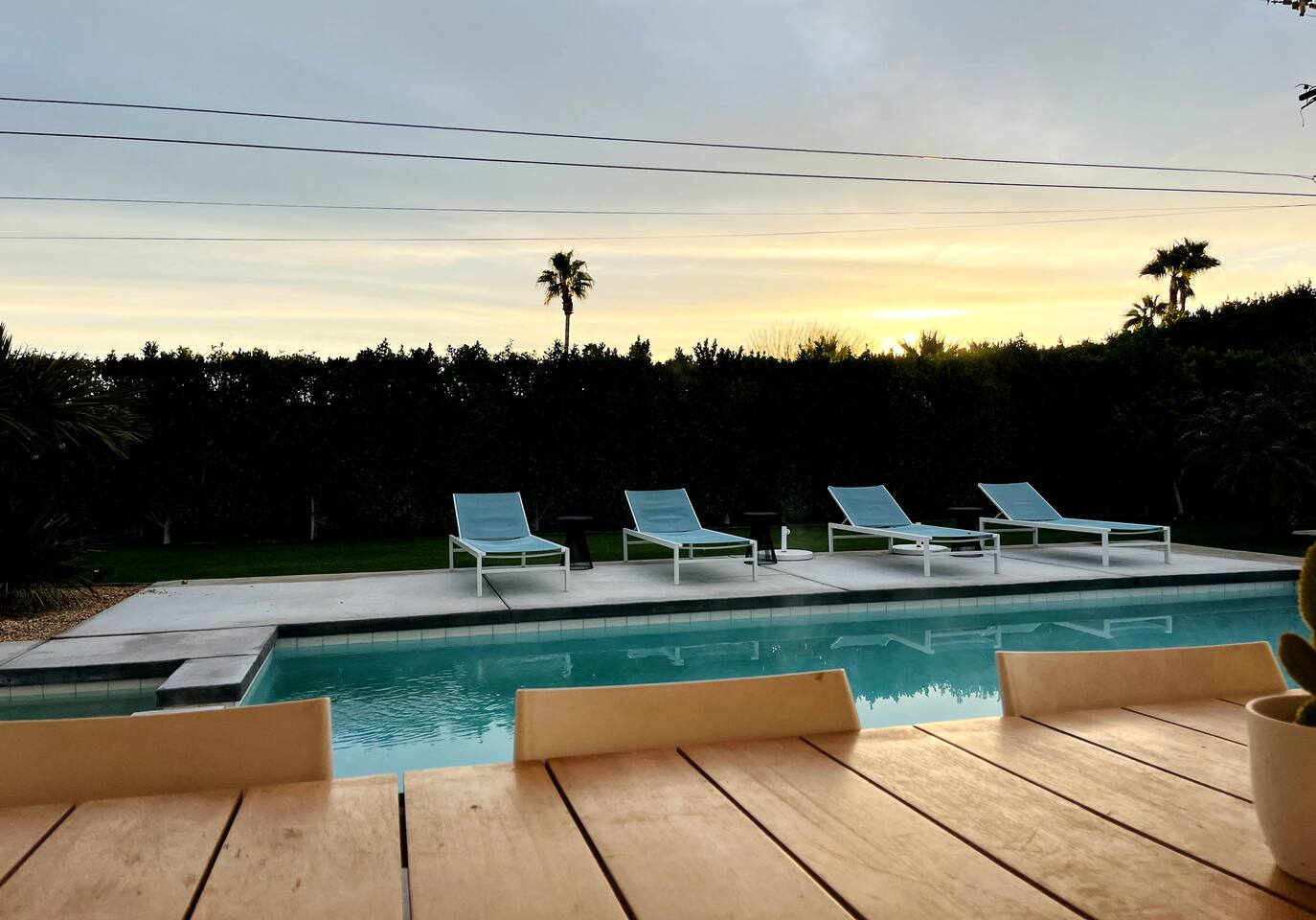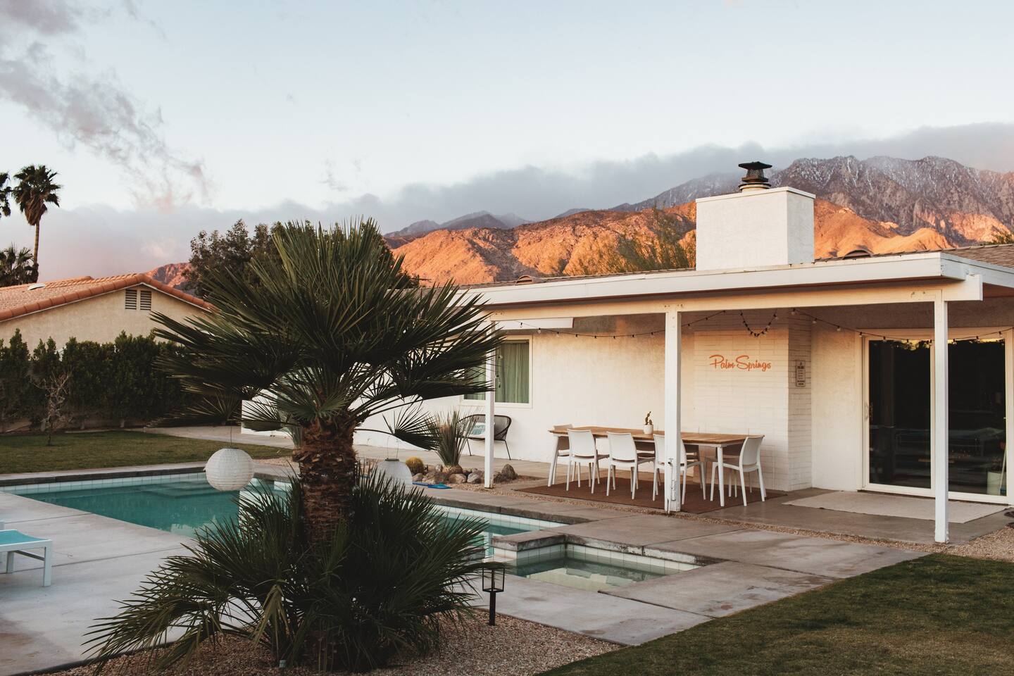 This sprawling California-style home features a new modern kitchen and sleek baths, a fabulous open concept layout and expansive walls of glass that blur the lines between indoor and outdoor living. Inside you'll find three large inspiring bedrooms, a dining area for up to 8 guests, a wood-burning fireplace, flat screen LED television, and high speed internet. There are 2 ways to reach the expansive backyard oasis - including 2 separate 8' sliders, revealing a resort-like poolside paradise. Outside you'll find breathtaking mountain views in every direction, a gorgeous private heated pool, a large open gas fire pit, brand new barbecue, a beautiful covered patio space with dining for 8, and a lawn perfect for playing boules, badminton, giant jenga, spike ball, and corn hole (all of which are provided, along with an assortment of pool toys). The deluxe private master suite offers direct pool access, a king-sized bed, an extra large walk-in closet and private sleek en suite bathroom with dual vanities. The two guest rooms share their own new, beautiful bathroom. Two of the bedrooms also have a dedicated work space for those needing to work from home or for children to homeschool. We have plenty of games for your use such as chess, checkers, poker, monopoly, scrabble, rummikub, dominoes and playing cards . The kitchen is fully stocked with all cooking ware, serving ware, and utensils, perfect for any aspiring chefs. For you coffee lovers there is a nespresso machine, a french press, and drip coffee. For you fresh juice/smoothie lovers, there is a bullet blender. We provide sealed organic hair and body products for each of our guest bathrooms. There is also a pack and play with organic sheets for your little ones, and two additional luxurious fold out beds. PLEASE NOTE THIS IS NOT A PARTY HOUSE THERE ARE VERY STRICT LAWS AROUND NOISE IN PALM SPRINGS We can also arrange a host of wellness add ons for those so inclined; from an amethyst pemf mat, to a vibration plate to a red light panel and a sauna blanket. We can also arrange yoga, meditation, and breath work classes. Hot tub heating is included in your stay, however pool heating, if required is $75 per night.