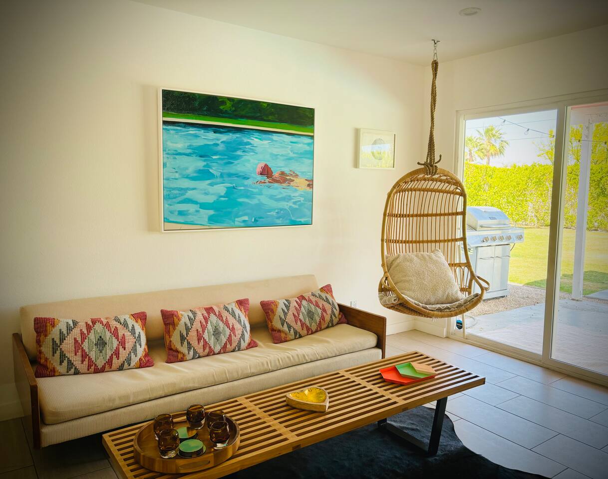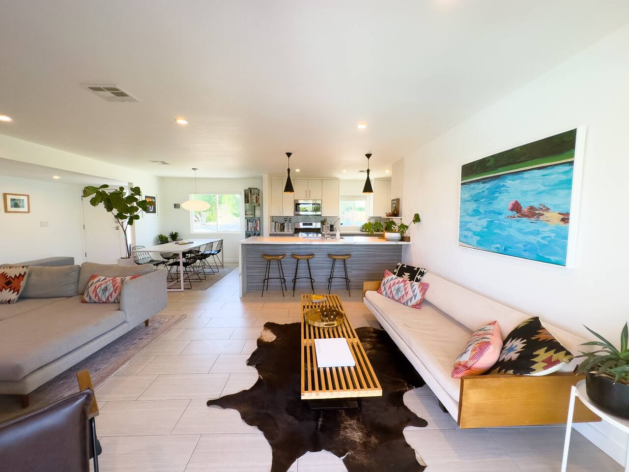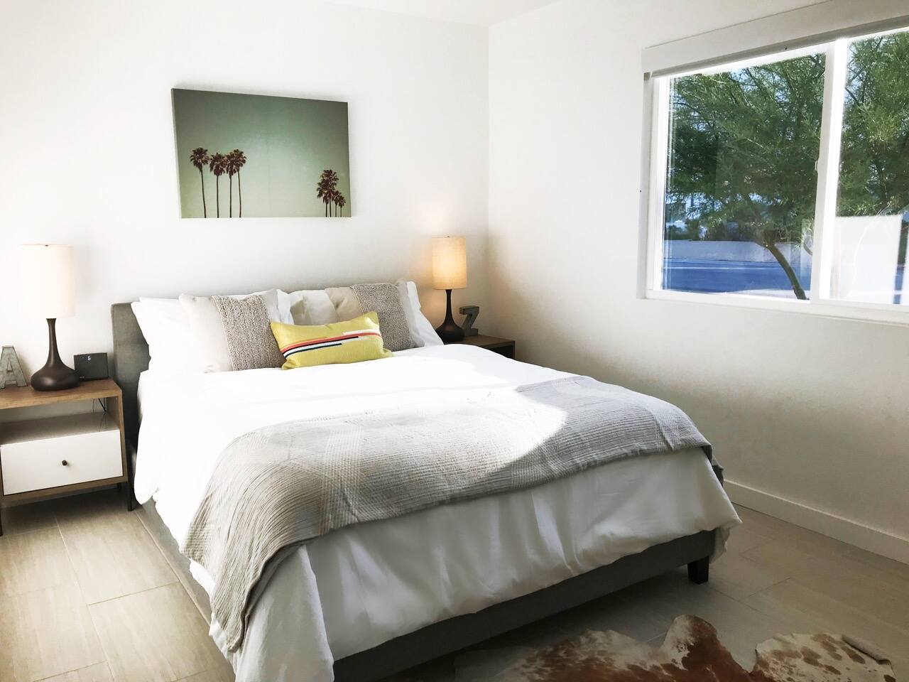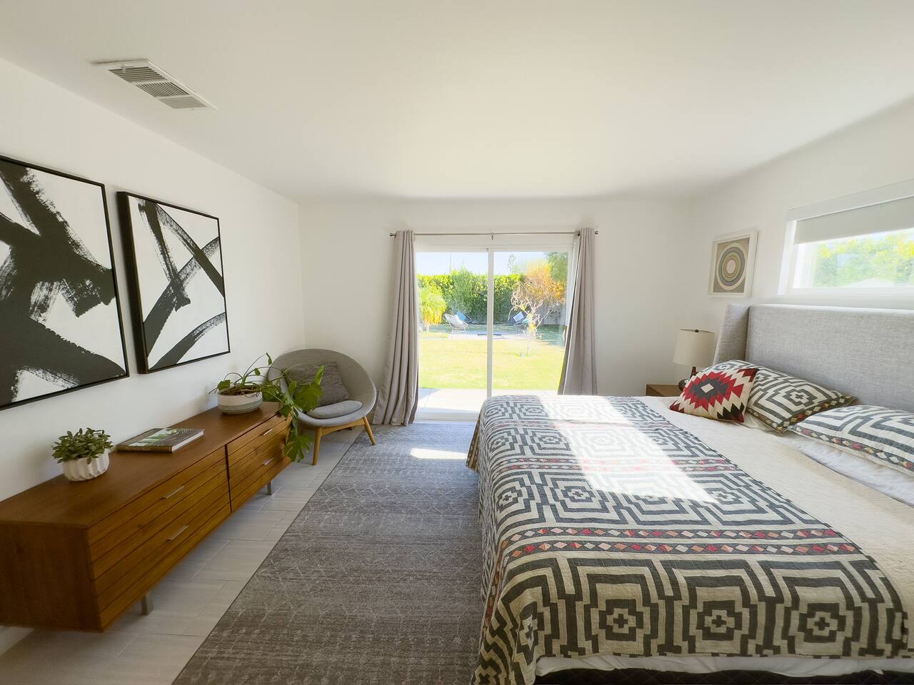 This sprawling California-style home features a new modern kitchen and sleek baths, a fabulous open concept layout and expansive walls of glass that blur the lines between indoor and outdoor living. Inside you'll find three large inspiring bedrooms, a dining area for up to 8 guests, a wood-burning fireplace, flat screen LED television, and high speed internet. There are 2 ways to reach the expansive backyard oasis - including 2 separate 8' sliders, revealing a resort-like poolside paradise. Outside you'll find breathtaking mountain views in every direction, a gorgeous private heated pool, a large open gas fire pit, brand new barbecue, a beautiful covered patio space with dining for 8, and a lawn perfect for playing boules, badminton, giant jenga, spike ball, and corn hole (all of which are provided, along with an assortment of pool toys). The deluxe private master suite offers direct pool access, a king-sized bed, an extra large walk-in closet and private sleek en suite bathroom with dual vanities. The two guest rooms share their own new, beautiful bathroom. Two of the bedrooms also have a dedicated work space for those needing to work from home or for children to homeschool. We have plenty of games for your use such as chess, checkers, poker, monopoly, scrabble, rummikub, dominoes and playing cards . The kitchen is fully stocked with all cooking ware, serving ware, and utensils, perfect for any aspiring chefs. For you coffee lovers there is a nespresso machine, a french press, and drip coffee. For you fresh juice/smoothie lovers, there is a bullet blender. We provide sealed organic hair and body products for each of our guest bathrooms. There is also a pack and play with organic sheets for your little ones, and two additional luxurious fold out beds. PLEASE NOTE THIS IS NOT A PARTY HOUSE THERE ARE VERY STRICT LAWS AROUND NOISE IN PALM SPRINGS We can also arrange a host of wellness add ons for those so inclined; from an amethyst pemf mat, to a vibration plate to a red light panel and a sauna blanket. We can also arrange yoga, meditation, and breath work classes. Hot tub heating is included in your stay, however pool heating, if required is $75 per night.