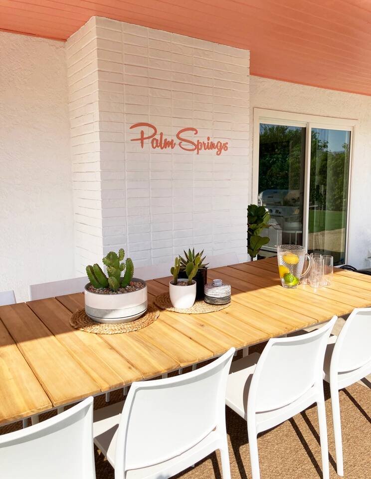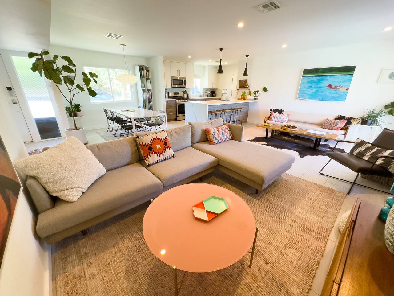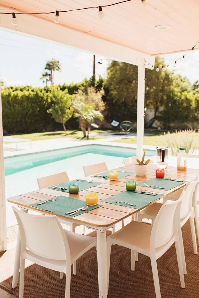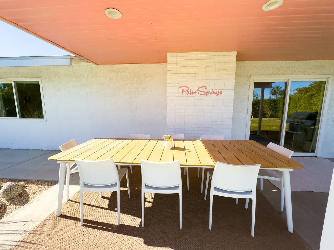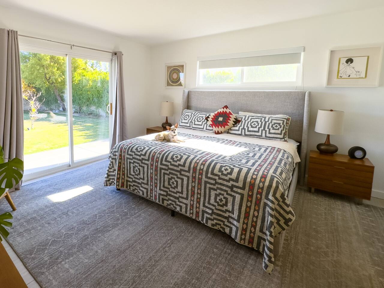 This sprawling California-style home features a new modern kitchen and sleek baths, a fabulous open concept layout and expansive walls of glass that blur the lines between indoor and outdoor living. Inside you'll find three large inspiring bedrooms, a dining area for up to 8 guests, a wood-burning fireplace, flat screen LED television, and high speed internet. There are 2 ways to reach the expansive backyard oasis - including 2 separate 8' sliders, revealing a resort-like poolside paradise. Outside you'll find breathtaking mountain views in every direction, a gorgeous private heated pool, a large open gas fire pit, brand new barbecue, a beautiful covered patio space with dining for 8, and a lawn perfect for playing boules, badminton, giant jenga, spike ball, and corn hole (all of which are provided, along with an assortment of pool toys). The deluxe private master suite offers direct pool access, a king-sized bed, an extra large walk-in closet and private sleek en suite bathroom with dual vanities. The two guest rooms share their own new, beautiful bathroom. Two of the bedrooms also have a dedicated work space for those needing to work from home or for children to homeschool. We have plenty of games for your use such as chess, checkers, poker, monopoly, scrabble, rummikub, dominoes and playing cards . The kitchen is fully stocked with all cooking ware, serving ware, and utensils, perfect for any aspiring chefs. For you coffee lovers there is a nespresso machine, a french press, and drip coffee. For you fresh juice/smoothie lovers, there is a bullet blender. We provide sealed organic hair and body products for each of our guest bathrooms. There is also a pack and play with organic sheets for your little ones, and two additional luxurious fold out beds. PLEASE NOTE THIS IS NOT A PARTY HOUSE THERE ARE VERY STRICT LAWS AROUND NOISE IN PALM SPRINGS We can also arrange a host of wellness add ons for those so inclined; from an amethyst pemf mat, to a vibration plate to a red light panel and a sauna blanket. We can also arrange yoga, meditation, and breath work classes. Hot tub heating is included in your stay, however pool heating, if required is $75 per night.