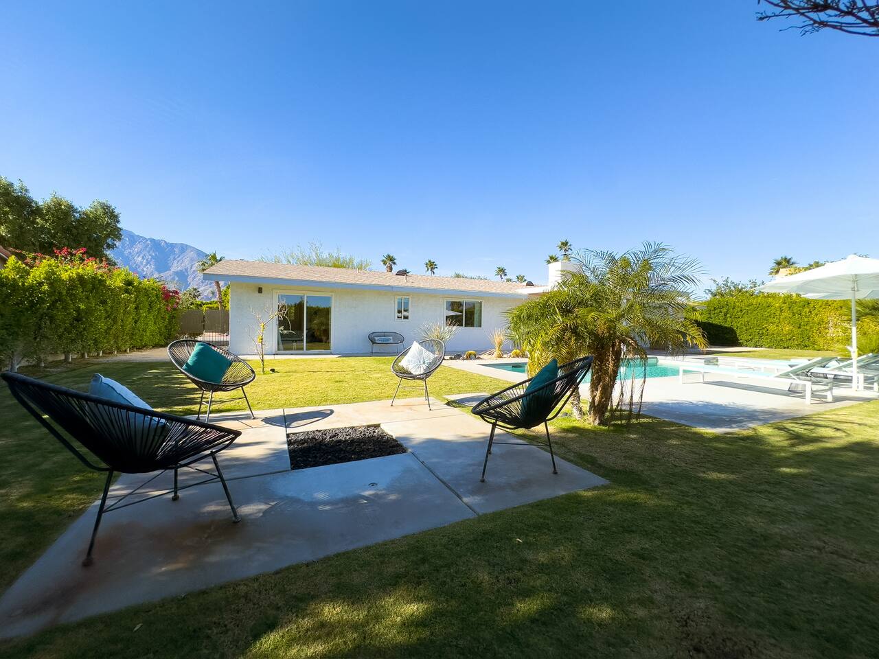 City ID 4142 This lovely updated home features a newly renovated kitchen, 2 sleek bathrooms, open concept layout & expansive walls of glass. 3 large bedrooms, multiple seating areas in the living room with wood-burning fireplace, flat screen LED TV, & high speed internet. In the garden you'll find palm trees, breathtaking mountain views, private pool and hot tub, fire pit with outdoor seating, barbecue, a beautiful covered patio space with dining for 8, & a huge lawn and outdoor games
