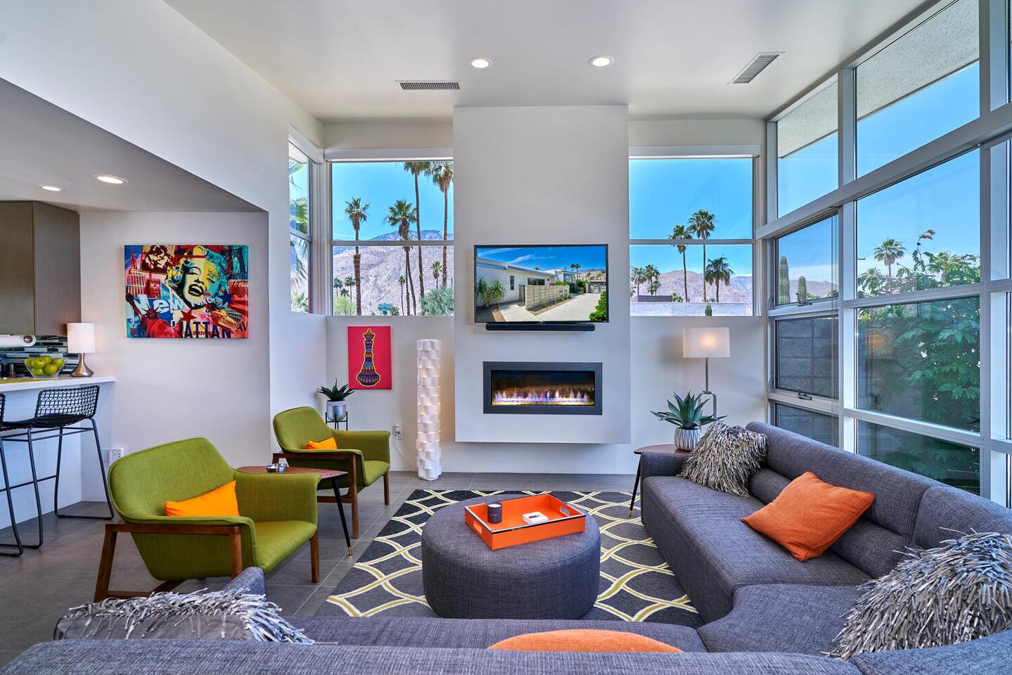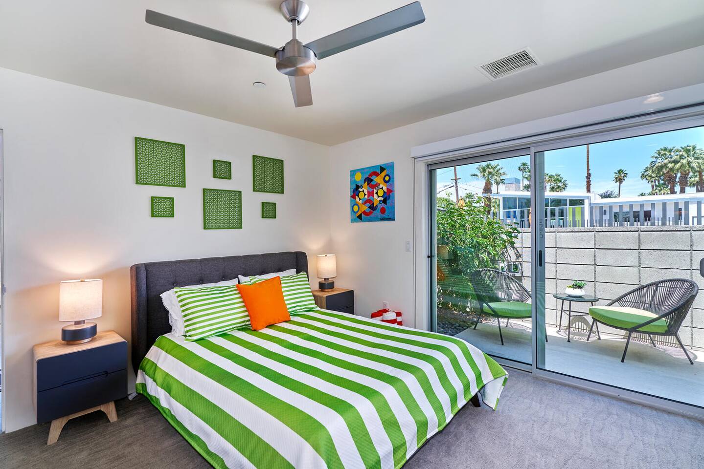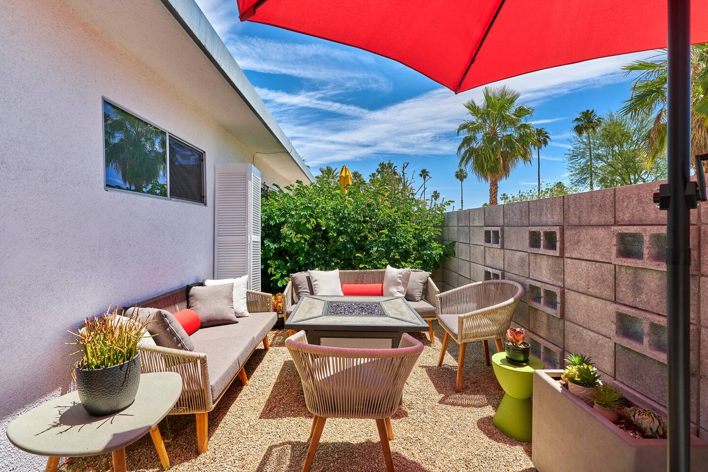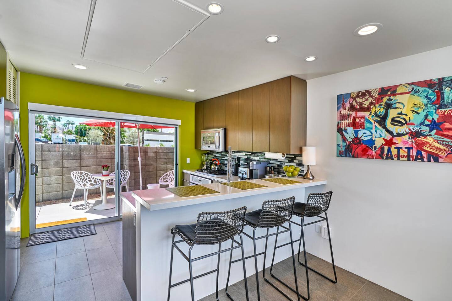 New Century Mod — Treat yourself to this quiet and luxurious experience and discover the Mid-Century inspired construction, impressive design and views inside and out. Ideal for a couple or party of 4. Your needs for a stellar getaway are provided, just bring your bags… unwind! This upscale complex of 9-units share a pool/spa and grill area. Peace will ease your mind into vacation mode. Nestled in Central Palm Springs and just minutes by car or short bike ride to all that downtown has to offer…