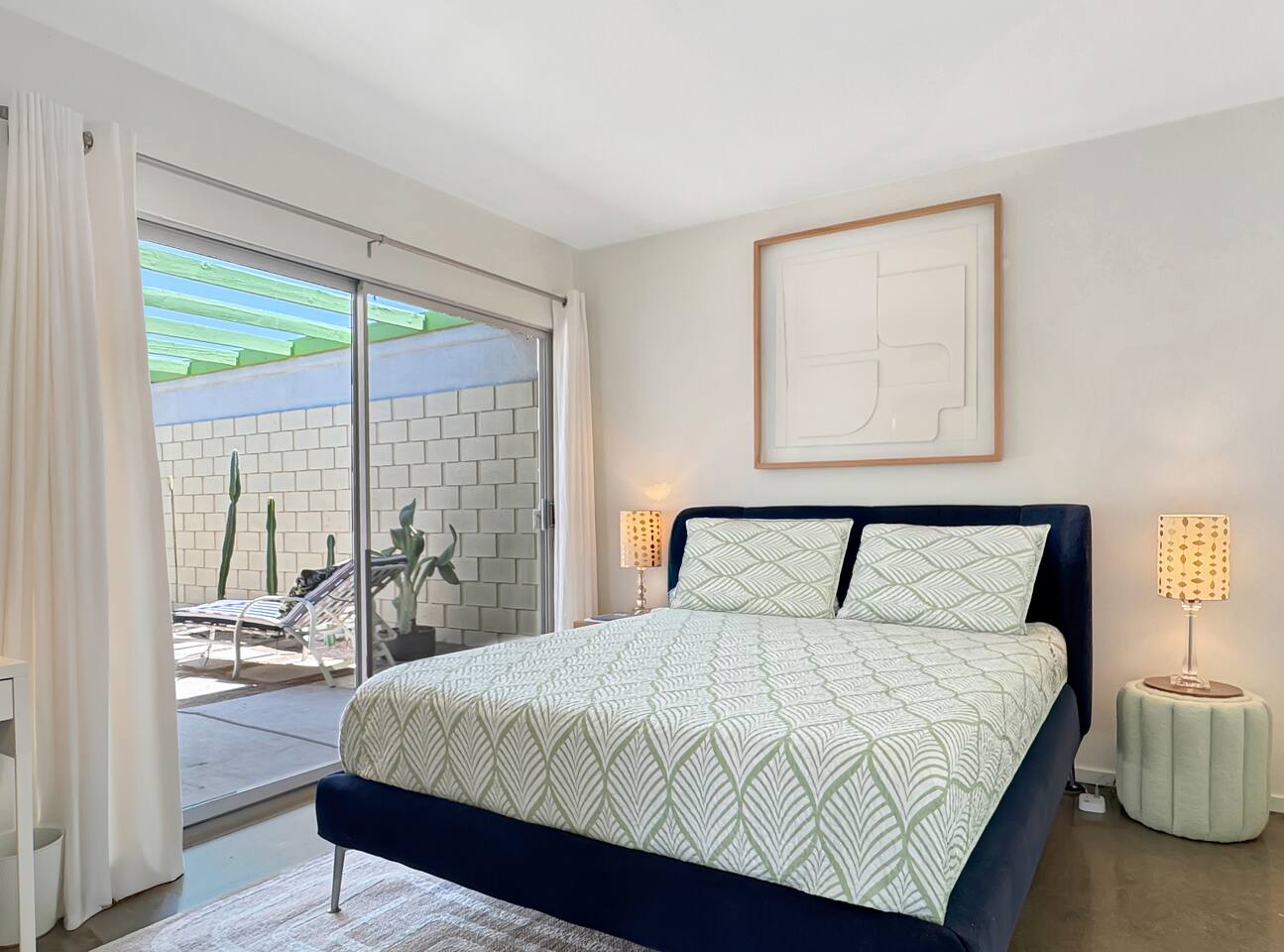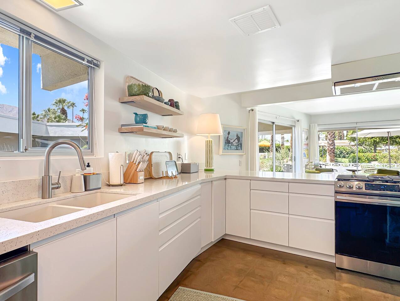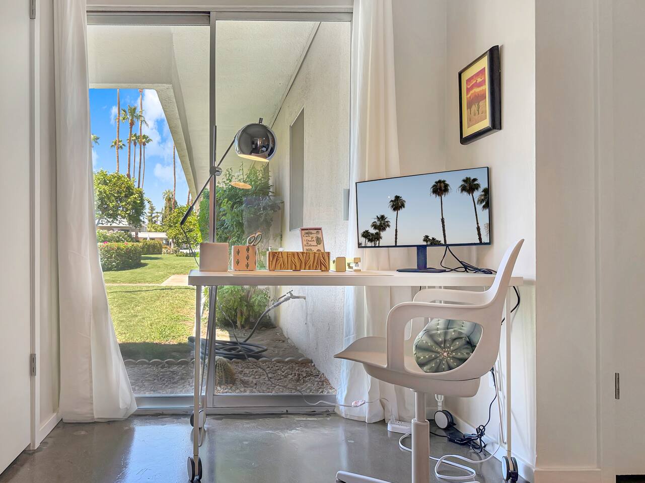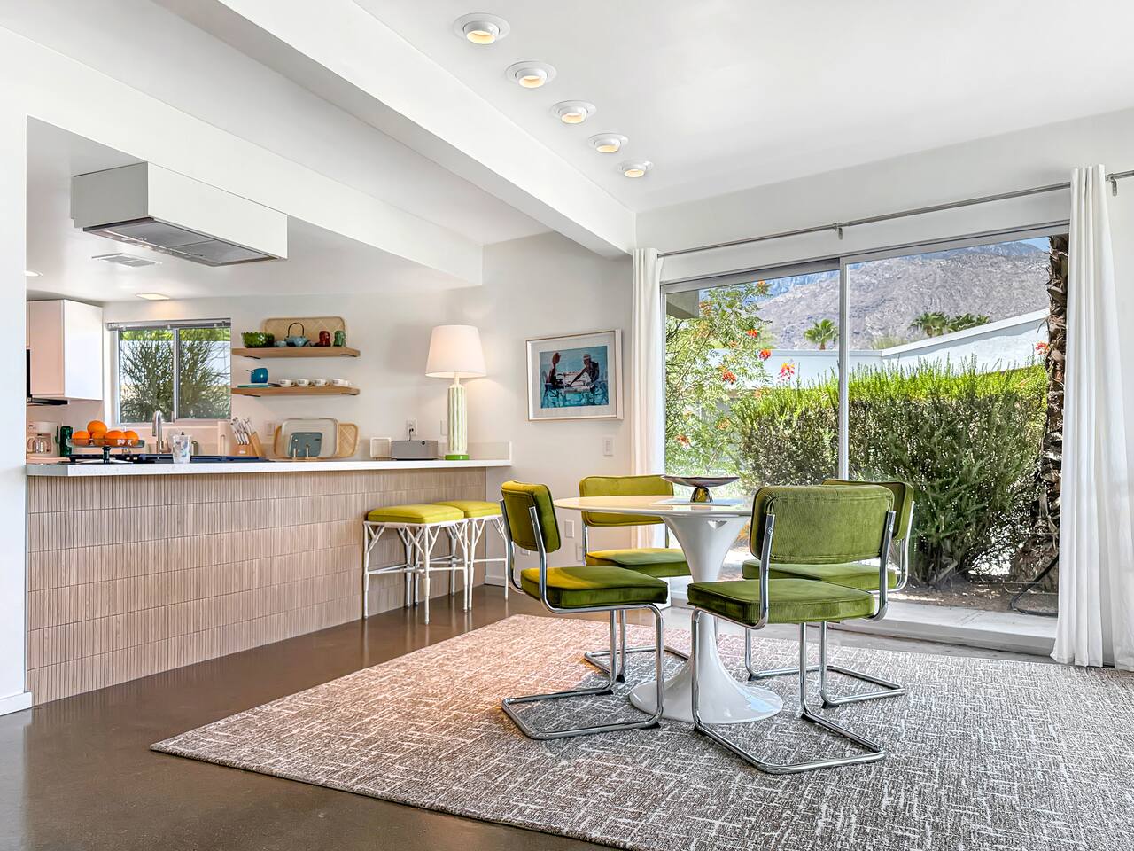 A modern desert sanctuary blending mid-century design with quiet luxury. Floor-to-ceiling sliding doors flood the space with light and connect you seamlessly to the outdoors. Clean lines, exposed concrete floors, and curated design details create a grounding, Zen-inspired atmosphere. ⸻ HIGHLIGHTS • Featured Property – Modernism Week 2026: Honored for its authentic mid-century architecture and design. • Living Area: Open-plan with mountain and garden views, access to outdoor patios, and Frame TV. • Kitchen: Newly renovated with stainless steel appliances, recessed lighting, custom cabinetry, and full-sized washer & dryer. • Primary Suite: Spacious and private with king size bed, TV, walk-in shower, and freestanding soaking tub. Also has a desk with computer monitor. • Second Bedroom: Queen size bed. Opens to the private cactus courtyard—ideal for guests or a home office. Also includes a secondary work station. ⸻ OUTDOOR LIVING Front Patio: Overlooks the pool and gardens with views of the San Jacinto Mountains. Private South-Facing Courtyard: Peaceful cactus garden for relaxation, meditation, or entertaining. Parking: Detached enclosed garage plus guest parking steps away. Community Amenities: Pool, hot tub, and citrus-lined walking paths framed by mountain views.