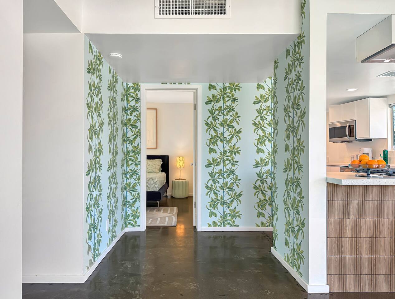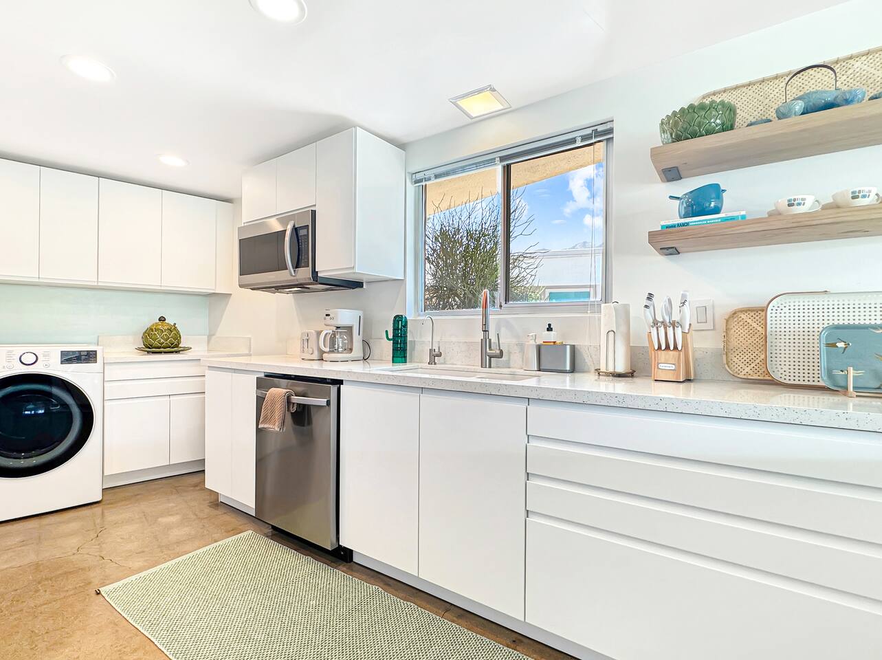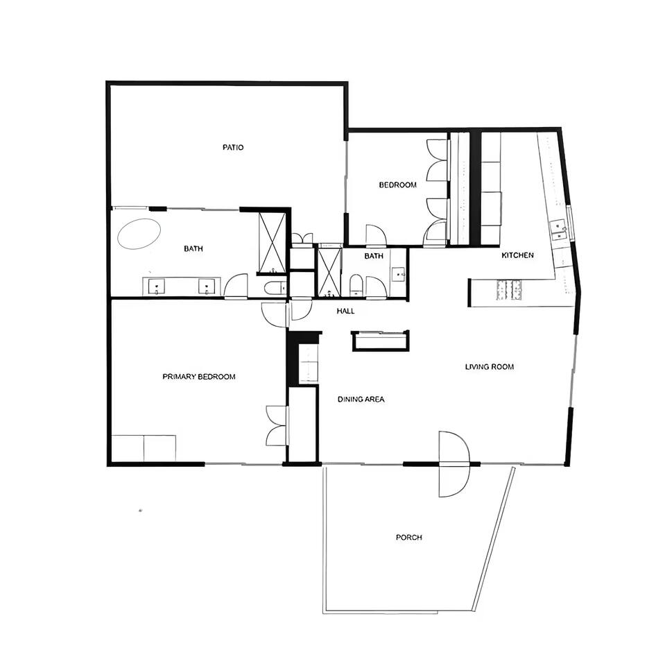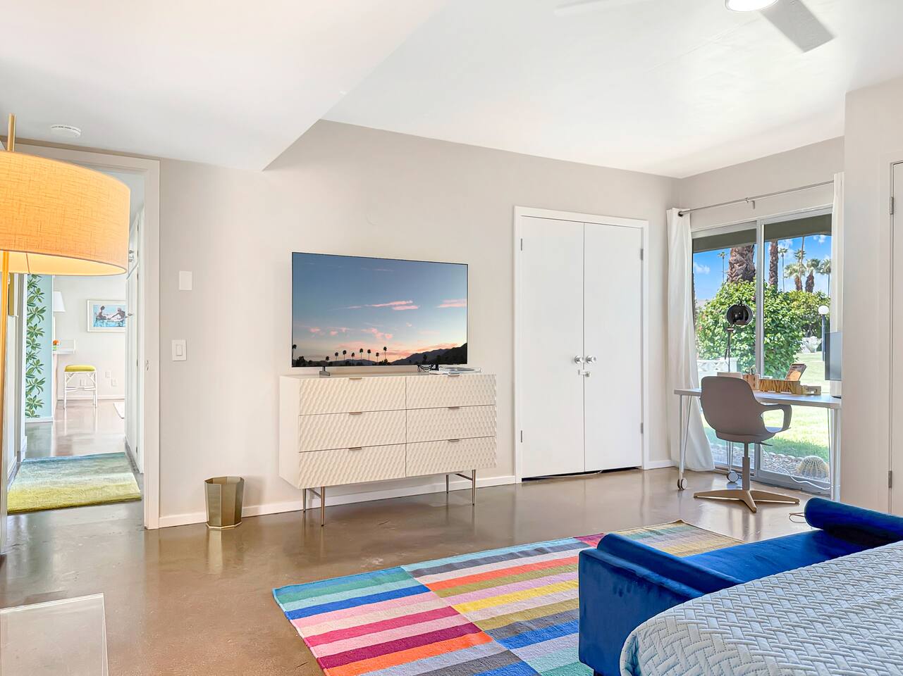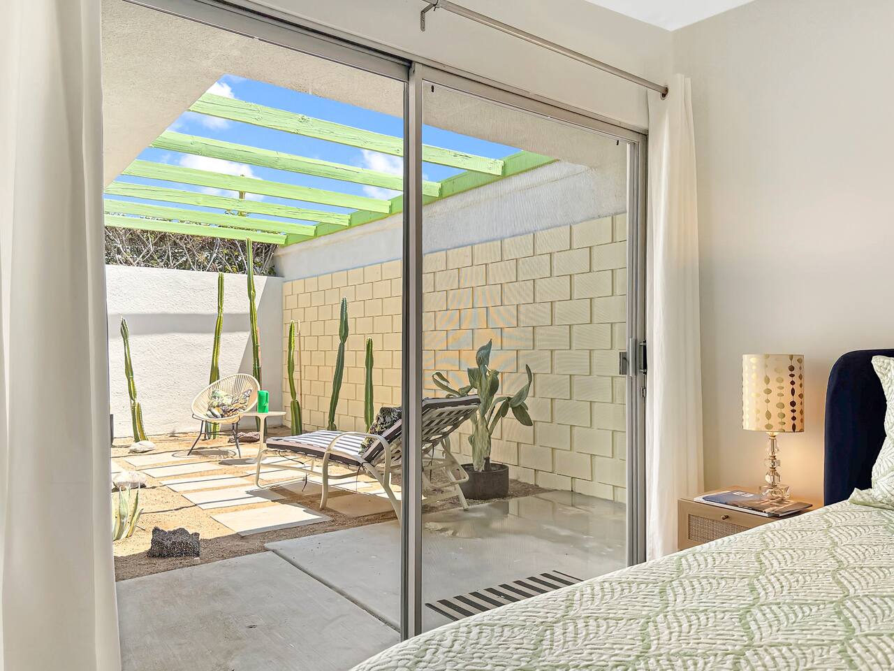 A modern desert sanctuary blending mid-century design with quiet luxury. Floor-to-ceiling sliding doors flood the space with light and connect you seamlessly to the outdoors. Clean lines, exposed concrete floors, and curated design details create a grounding, Zen-inspired atmosphere. ⸻ HIGHLIGHTS • Featured Property – Modernism Week 2026: Honored for its authentic mid-century architecture and design. • Living Area: Open-plan with mountain and garden views, access to outdoor patios, and Frame TV. • Kitchen: Newly renovated with stainless steel appliances, recessed lighting, custom cabinetry, and full-sized washer & dryer. • Primary Suite: Spacious and private with king size bed, TV, walk-in shower, and freestanding soaking tub. Also has a desk with computer monitor. • Second Bedroom: Queen size bed. Opens to the private cactus courtyard—ideal for guests or a home office. Also includes a secondary work station. ⸻ OUTDOOR LIVING Front Patio: Overlooks the pool and gardens with views of the San Jacinto Mountains. Private South-Facing Courtyard: Peaceful cactus garden for relaxation, meditation, or entertaining. Parking: Detached enclosed garage plus guest parking steps away. Community Amenities: Pool, hot tub, and citrus-lined walking paths framed by mountain views.