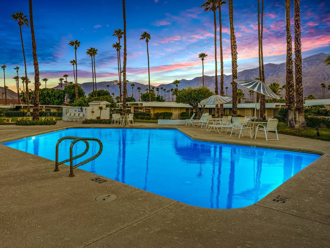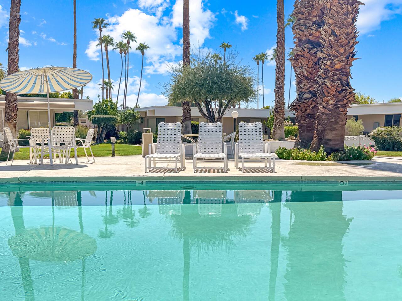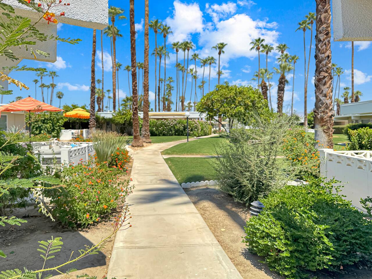 Built in 1963, Firebird Estates is a historic mid-century community located just minutes from downtown Palm Springs. Inspired by post-war ideals of simplified, communal living, the development reflects the era’s commitment to low-density design, seamless indoor-outdoor flow, and architectural restraint. Homes are arranged to preserve privacy while offering shared access to open green spaces, a sparkling pool, and spa framed by palm trees and panoramic mountain views. Unlike many high-density complexes, Firebird Estates was designed to feel like a neighborhood, not a compound—making it a rare gem in central Palm Springs. This legacy is still celebrated today, including recent features in Modernism Week’s architectural tours.